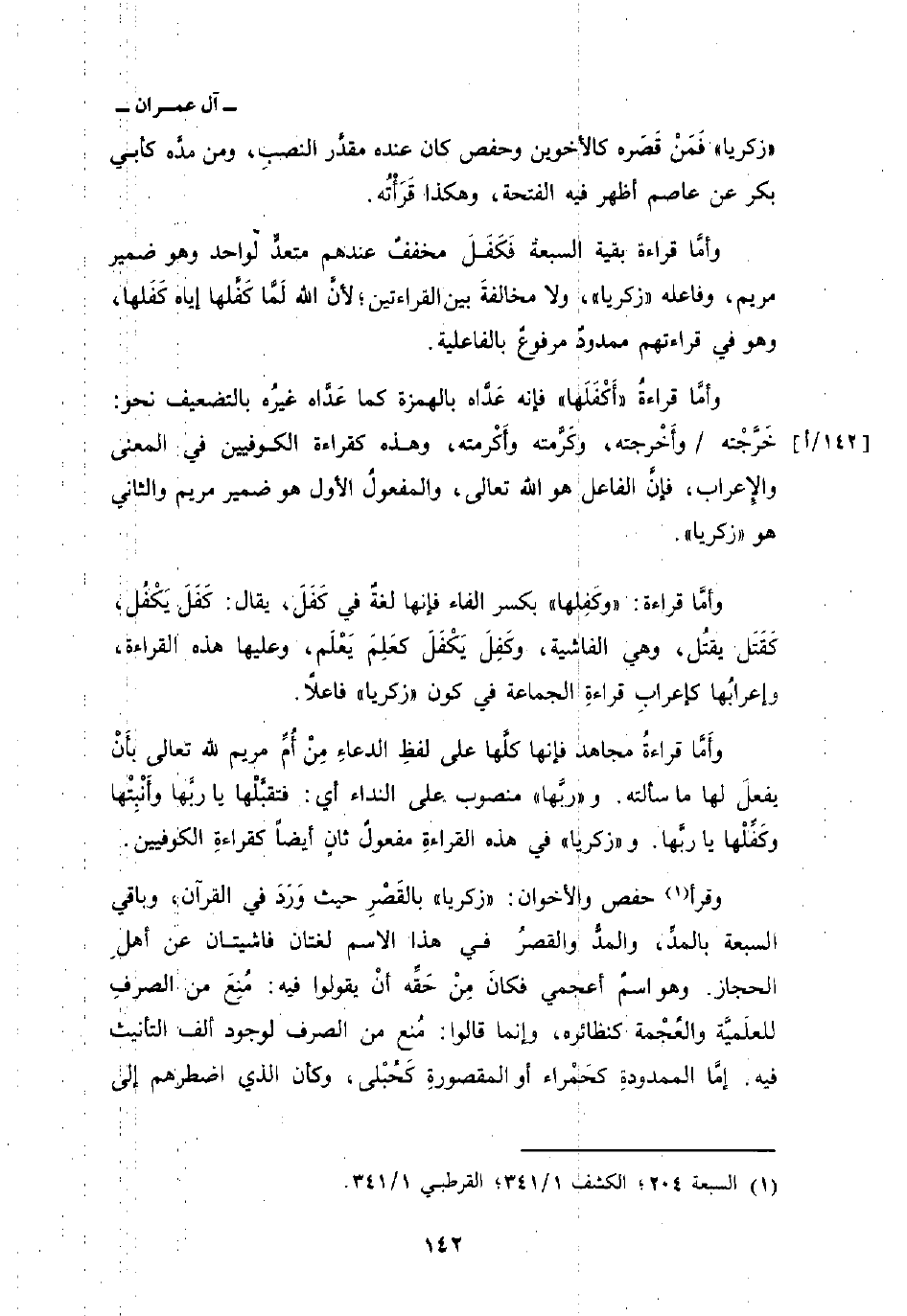 وقرأ حفص والأخوان: «زكريا» بالقَصْرِ حيث وَرَدَ في القرآن، وباقي السبعة بالمدِّ، والمدُّ والقصرُ في هذا الاسم لغتان فاشيتان عن أهلِ الحجاز. وهو اسمٌ أعجمي فكانَ مِنْ حَقِّه أنْ يقولوا فيه: مُنِعَ من الصرفِ للعلَميَّة والعُجْمة كنظائره، وإنما قالوا: مُنع من الصرف لوجود ألف التأنيث فيه. إمَّا الممدودةِ كحَمْراء أو المقصورةِ كَحُبْلى، وكأن الذي اضطرهم إلى