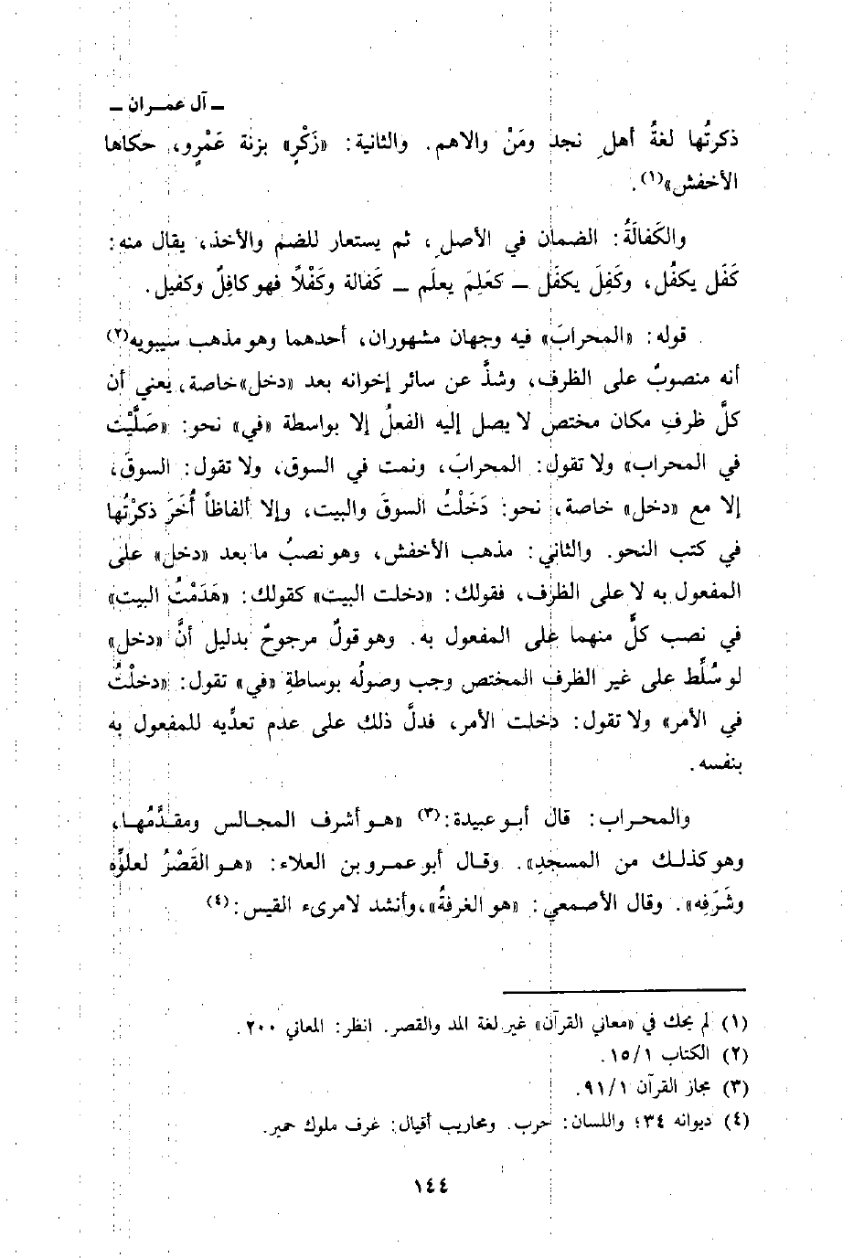 والمحراب: قال أبو عبيدة: «هو أشرف المجالس ومقدَّمُها، وهو كذلك من المسجدِ» . وقال ابو عمرو بن العلاء: «هو القَصْرُ لعلوِّه وشَرَفِه» . وقال الأصمعي: «هو الغرفةُ» وأنشد لامرىء القيس:
