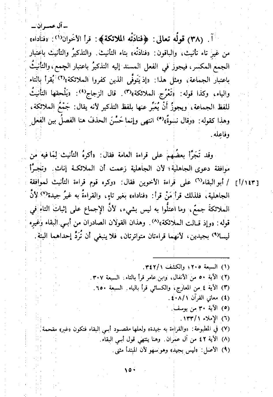 وقد تَجَرَّأ بعضُهم على قراءة العامة فقال:» أكرهُ التأنيث لِمَا فيه من مو-افقة دعوى الجاهلية؛ لأن الجاهلية زعمت أن الملائكة إناث. وتجرَّأ/ أبو البقاء على قراءة الأخوين فقال: «وكره قوم قراءة التأنيث لموافقة الجاهلية، فلذلك قرأ مَنْ قرأ:» فناداه «بغير تاءٍ، والقراءةُ به غيرُ جيدة لأنَّ الملائكةَ جمعٌ، وما اعتلُّوا به ليس بشيء، لأنَّ الإِجماع على إثبات التاء في قوله: {وَإِذْ قَالَتِ الملائكة} [آل عمران: 42] . وهذان القولان الصادران من أبي البقاء وغيرِه ليسا بجيدين، لأنهما قراءتان متواترتان، فلا ينبغي أن تُرَدَّ إحداهما البتة.