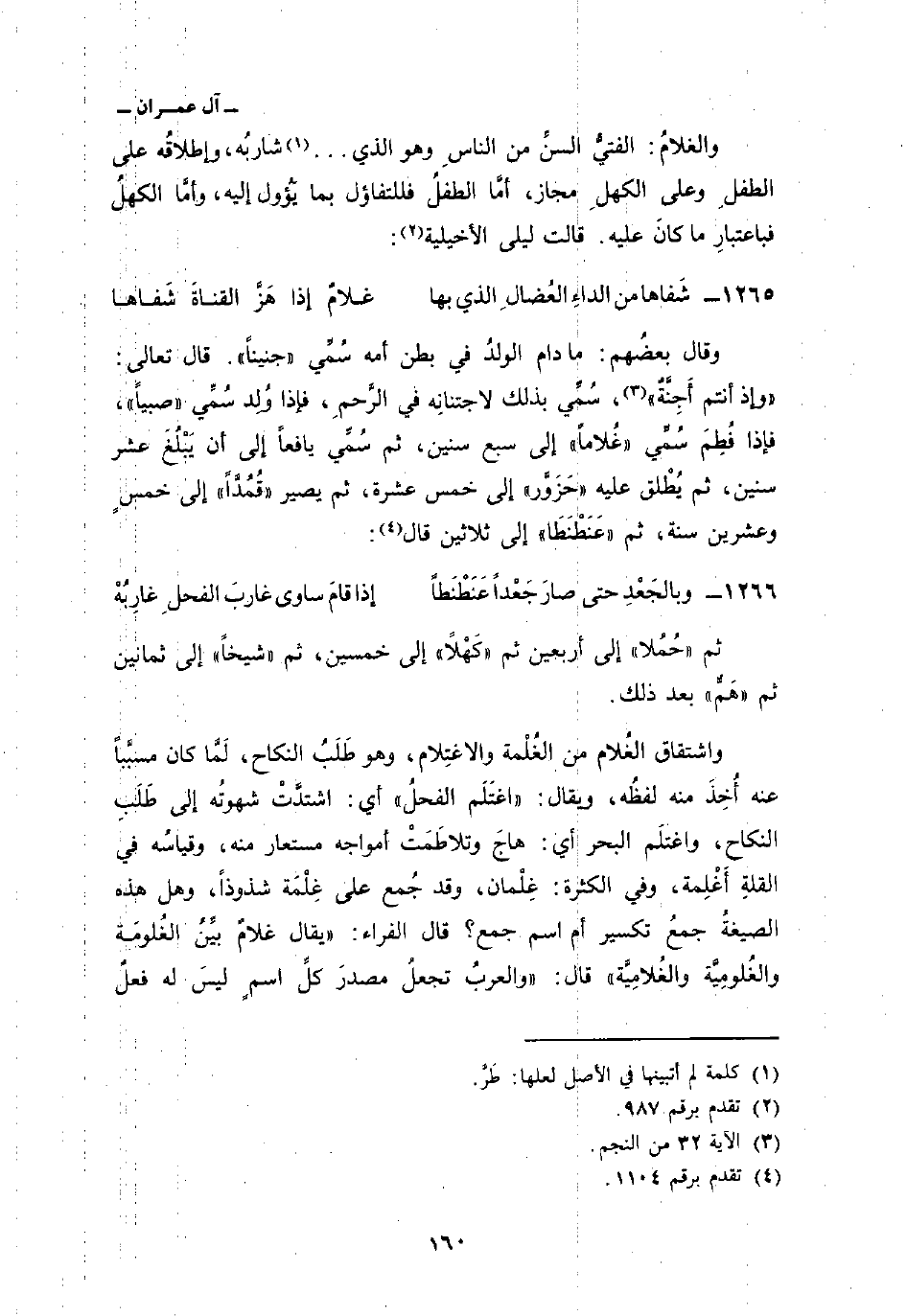 وقال بعضُهم: ما دام الولدُ في بطن أمه سُمِّي «جنيناً» . قال تعالى: {وَإِذْ أَنتُمْ أَجِنَّةٌ} [النجم: 32] ، سُمِّي بذلك لاجتنانِه في الرَّحمِ، فإذا وُلِد سُمِّي «صبياً» فإذا فُطِمَ سُمِّي «غُلاماً» إلى سبع سنين، ثم سُمِّي يافعاً إلى أن يَبْلُغَ عشر سنين، ثم يُطْلق عليه «حزَوَّر» إلى خمس عشرة، ثم يصير «قُمُدَّاً» إلى خمسٍ وعشرين سنة، ثم، «عَنَطْنَطَا» إلى ثلاثين قال: