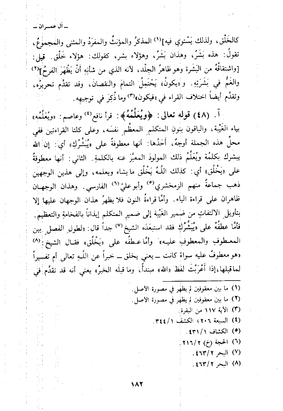 قوله تعالى: {وَيُعَلِّمُهُ} : قرأ نافع وعاصم: «ويُعَلِّمُه» بياء الغَيْبَة، والباقون بنونِ المتكلمِ المعظِّمِ نفسَه، وعلى كلتا القراءتين ففي محلِّ هذه الجملة أوجهٌ، أَحَدُها: أنها معطوفةٌ على «يُبَشِّرُكِ» أي: إن الله يبشرك بكلمةُ ويُعَلِّمُ ذلك المولودَ المعبَّرَ عنه بالكلمةِ. الثاني: أنها معطوفةٌ على «يَخْلُق» أي: كذلك اللهُ يَخْلُق ما يشاء ويعلمه، وإلى هذين الوجهين ذهب جماعةٌ منهم الزمخشري وأبو عليّ الفارسي. وهذا الوجهان ظاهران على قراءة الياء. وأمَّا قراءةُ النون فلا يظهرُ هذان الوجهان عليها إلا بتأويلِ الالتفاتِ من ضمير الغَيْبة إلى ضميرِ المتكلم إيذاناً بالفخامةِ والتعظيم. فأمَّا عطفُهُ على «يُبَشِّرُكِ» فقد استبعَدَه الشيخ جداً قال: «لطولِ الفصلِ بين المعطوفِ والمعطوفِ عليه» وأمَّا عطفُه على «يَخْلُق» فقال الشيخ: «وهو معطوفٌ عليه سواءً كانت يعني يخلق خبراً عن اللهِ تعالى أم تفسيراً لما قبلها، إذا أَعْرَبْتَ لفظ» الله «مبتدأً، وما قبلَه الخبرُ» يعني أنه قد تقدَّم في