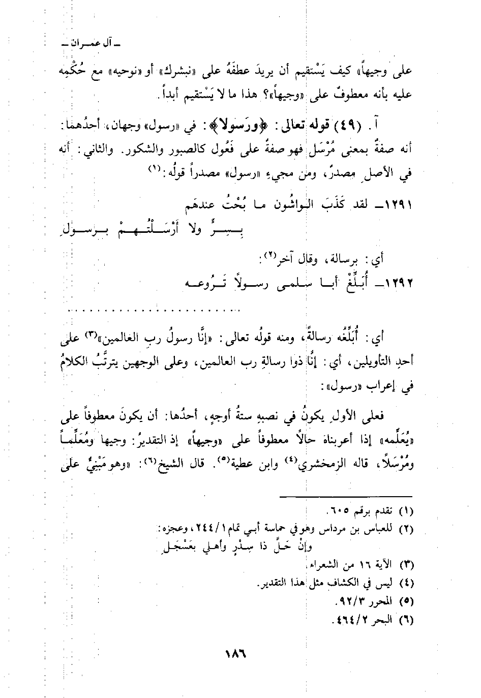 فعلى الأولِ يكونُ في نصبهِ ستةُ أوجهٍ، أحدُها: أن يكونَ معطوفاً على «يُعَلِّمه» إذا أعربناه حالاً معطوفاً على «وجيهاً» إذ التقديرُ: وجيها ومُعَلِّماً ومُرْسَلاً، قاله الزمخشري وابن عطية. قال الشيخ: «وهو مَبْنِيٌّ على