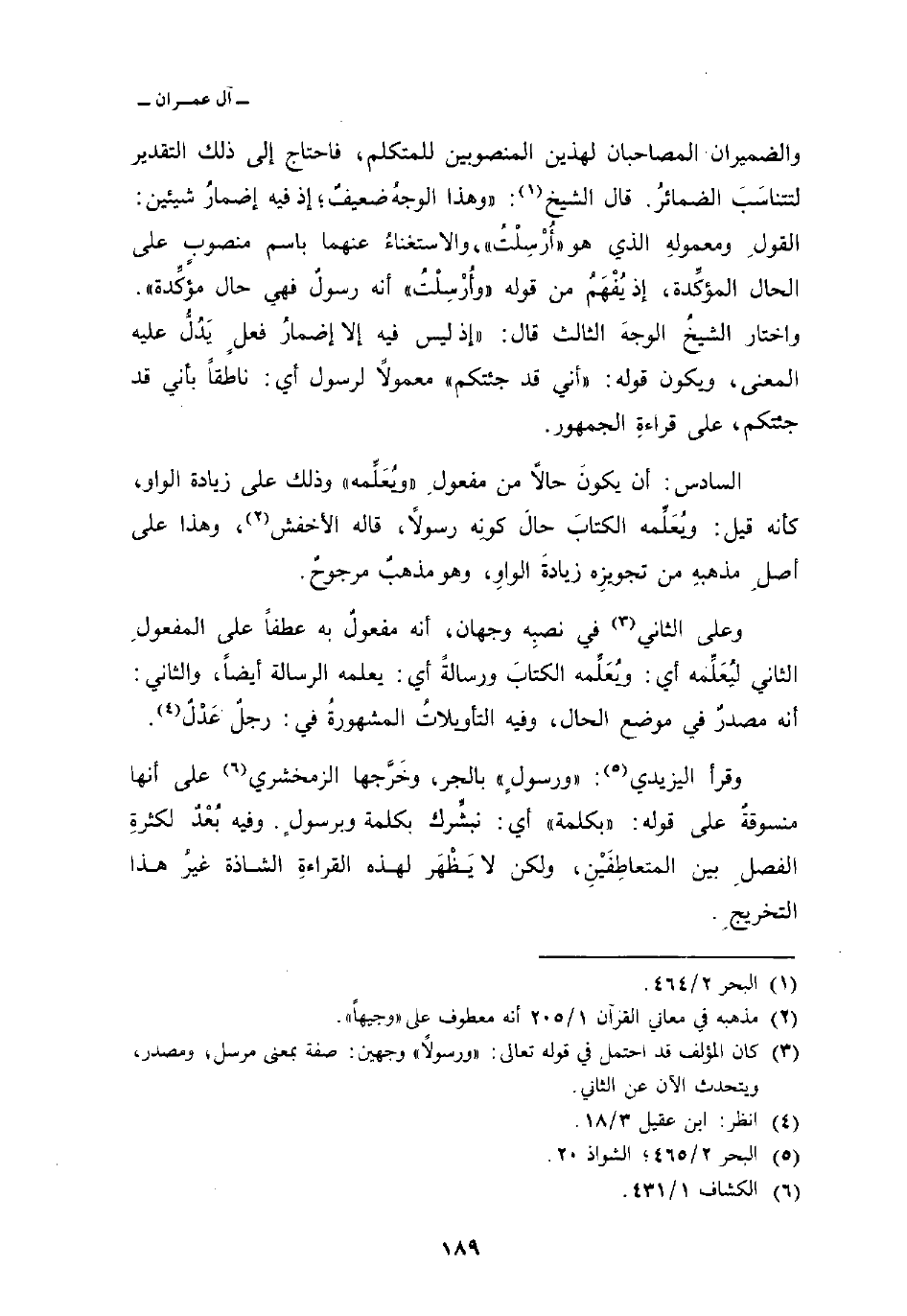 والضميران المصاحبان لهذين المنصوبين للمتكلم، فاحتاج إلى ذلك التقدير لتتناسَبَ الضمائرُ. قال الشيخ:» وهذا الوجهُ ضعيفٌ؛ إذ فيه إضمارُ شيئين: القولِ ومعمولهِ الذي هو «أُرْسِلْتُ» ، والاستغناءُ عنهما باسم منصوبٍ على الحال المؤكِّدة، إذ يُفْهَمُ من قوله «وأُرْسِلْتُ» أنه رسولٌ فهي حال مؤكِّدة «. واختار الشيخُ الوجَه الثالث قال:» إذ ليس فيه إلا إضمارُ فعلٍ يَدُلُّ عليه المعنى، ويكون قوله: {أَنِّي قَدْ جِئْتُكُمْ} معمولاً لرسول أي: ناطقاً بأني قد جئتكم، على قراءة ِ الجمهور.
