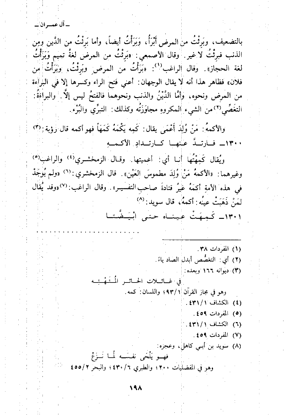 1300 - فارتدَّ عنها كارتدادِ الأكمهِ ... ويُقال كَمِهْتُها أنا أي: أعميتها. وقال الزمخشري والراغب وغيرهما: «الأكمهُ مَنْ وُلِدَ مطموسَ العَيْن» . قال الزمخشري: «ولم يُوجَدْ في هذه الأمةِ أكمَهُ غيرُ قتادةَ صاحبِ التفسير» . وقال الراغب: «وقد يُقال لمَنْ ذَهَبَتْ عينُه: أكمهُ، قال سويد: