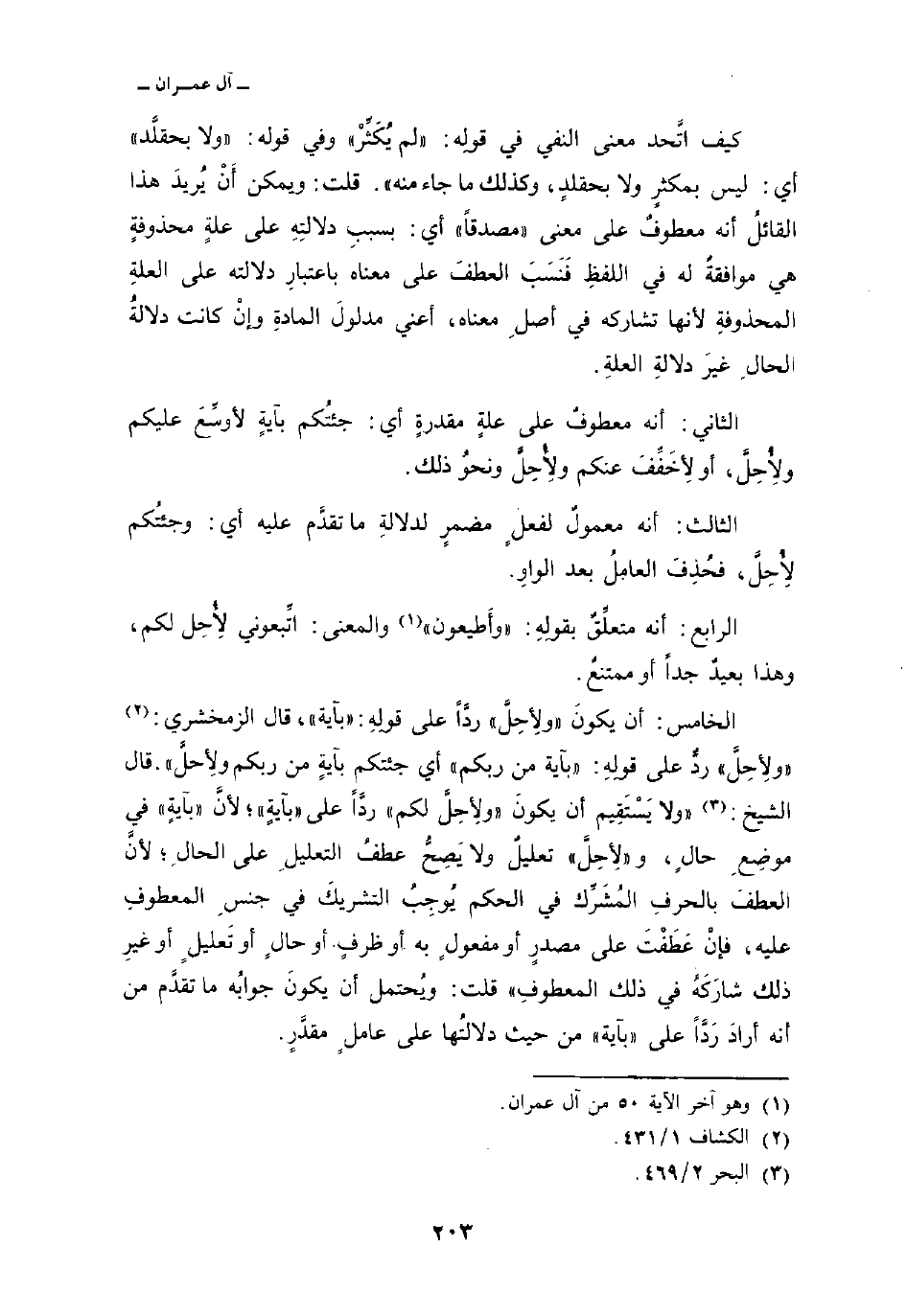 الخامس: أن يكونَ «ولأِحِلَّ» ردَّاً على قولِهِ: «بآية» ، قال الزمخشري: «ولأِحِلَّ» ردٌّ على قولِه: {بِآيَةٍ مِّن رَّبِّكُمْ} أي «جئتكم بآيةٍ من ربكم ولأِحلَّ» . قال الشيخ: «ولا يَسْتَقِيم أن يكونَ» ولإِحلَّ لكم «ردَّاً على» بآيةٍ «؛ لأنَّ» بآية «في موضِعِ حالٍ، و» لأِحِلَّ «تعليلٌ ولا يَصِحُّ عطفُ التعليلِ على الحالِ؛ لأنَّ العطفَ بالحرفِ المُشَرِّك في الحكم يُوجِبُ التشريكَ في جنسِ المعطوفِ عليه، فإنْ عَطَفْتَ على مصدرٍ أو مفعولٍ به أو ظرفٍ أو حالٍ أو تعَليلٍ أو غيرِ ذلك شارَكَهُ في ذلك المعطوفِ» قلت: ويُحتمل أن يكونَ جوابُه ما تقدَّم من أنه أرادَ رَدًّاً على «بآية» من حيث دلالتُها على عاملٍ مقدَّرٍ.