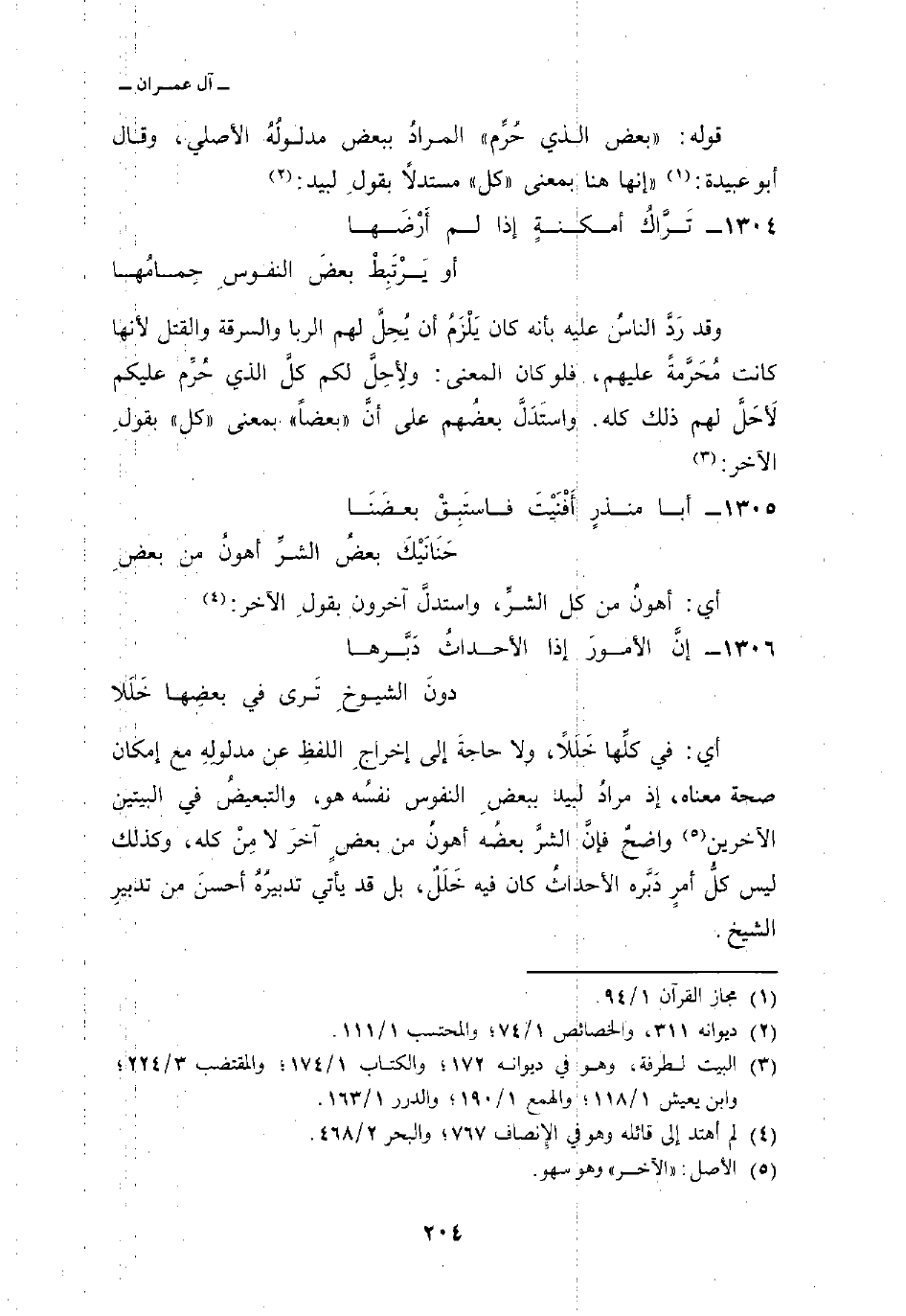 أي: في كلِّها خَلَلاً، ولا حاجةً إلى إخراجِ اللفظِ عن مدلولِهِ مع إمكان صحة معناه، إذ مرادُ لبيد ببعضٍ النفوس نفسُه هو، والتبعيضُ في البيتين الآخرين واضحٌ فإنَّ الشرَّ بعضُه أهونُ من بعضٍ آخرَ لا مِنْ كله، وكذلك ليس كلُّ أمرٍ دَبَّره الأحداثُ كان فيه خَلَلٌ، بل قد يأتي تدبيرُهُ أحسنَ من تدبيرِ الشيخ.