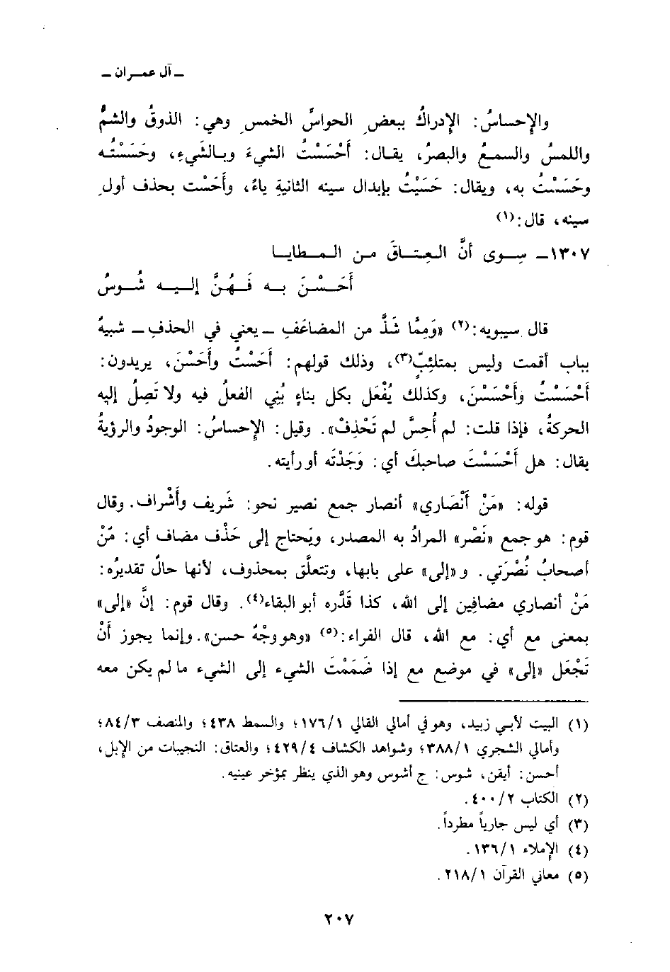 قال سيبويه: «وَمِمَّا شَذَّ من المضاعَفِ يعني في الحذفِ شبيهُ بباب أقمت وليس بمتلئِبٍّ، وذلك قولهم: أَحَسْتُ واَحَسْنَ، يريدون: أَحْسَسْتُ وأَحْسَسْنَ، وكذلك يُفْعَل بكل بناءٍ بُنِي الفعلُ فيه ولا تَصِلُ إليه الحركةُ، فإذا قلت: لم أُحِسَّ لم تَحذِفْ» . وقيل: الإِحساسُ: الوجودُ والرؤيةُ يقال: هل أَحْسَسْتَ صاحبكَ أي: وَجَدْتَه أو رأيته.