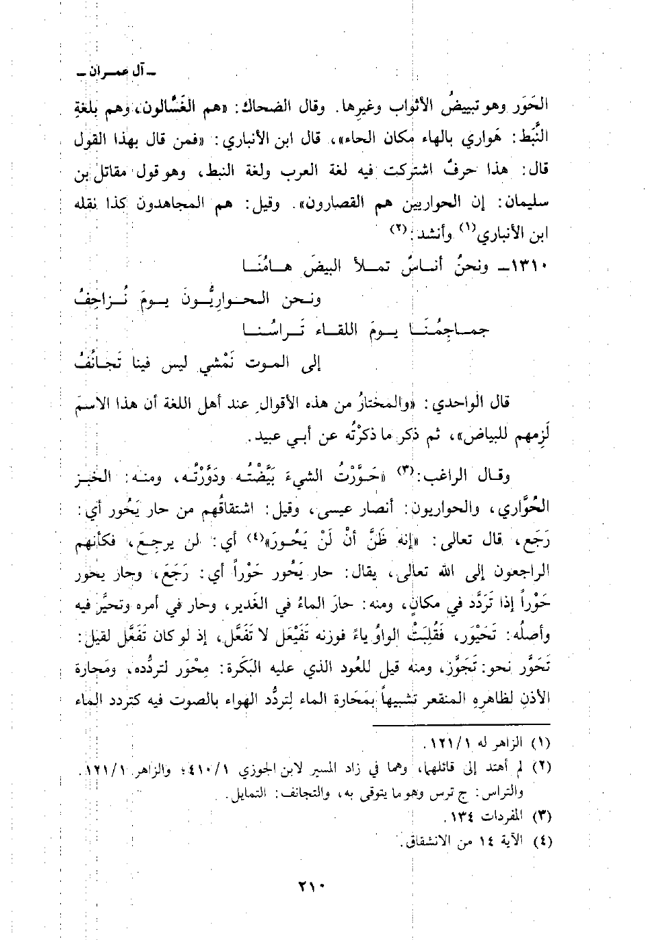 وقال الراغب:» حَوَّرْتُ الشيءَ بَيَّضْتُه ودَوَّرْتُه، ومنه: الخبز الحُوَّاري، والحواريون: أنصار عيسى، وقيل: اشتقاقُهم من حار يَحُور أي: رَجَع، قال تعالى: {إِنَّهُ ظَنَّ أَن لَّن يَحُورَ} [الإنشقاق: 4] أي: لن يرجِعَ، فكأنهم الراجعون إلى الله تعالى، يقال: حار يَحُور حَوْراً أي: رَجَعَ، وحار يحور حَوْراً إذا تَرَدَّد في مكانٍ، ومنه: حارَ الماءُ في الغَدير، وحار في أمره وتحيَّر فيه وأصلُه: تَحَيْوَر، فَقُلِبَتْ الواوُ ياءً فوزنه تَفَيْعَل لا تَفَعَّل، إذ لو كان تَفَعَّل لقيل: تَحَوَّر نحو: تَجَوَّز، ومنه قيل للعُود الذي عليه البَكَرة: مِحْوَر لتردُّده، ومَحارة الأذنِ لظاهرِهِ المنقعر تشبيهاً بمَحَارة الماء لِتردُّد الهواء بالصوت فيه كتردد الماء