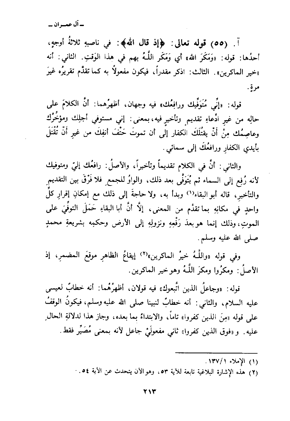 قوله: {إِنِّي مُتَوَفِّيكَ وَرَافِعُكَ} فيه وجهان، أظهرُهما: أنَّ الكلامَ على حالهِ من غيرِ ادِّعاءِ تقديمٍ وتأخيرٍ فيه، بمعنى: إني مستوفي أجلِك ومؤخِّرُك وعاصِمُك مِنْ أَنْ يقتُلَكَ الكفار إلى أن تموتَ حَتْفَ أنفِكَ من غيرِ أَنْ تُقْتَلَ بأيدي الكفارِ ورافعُكَ إلى سمائي.