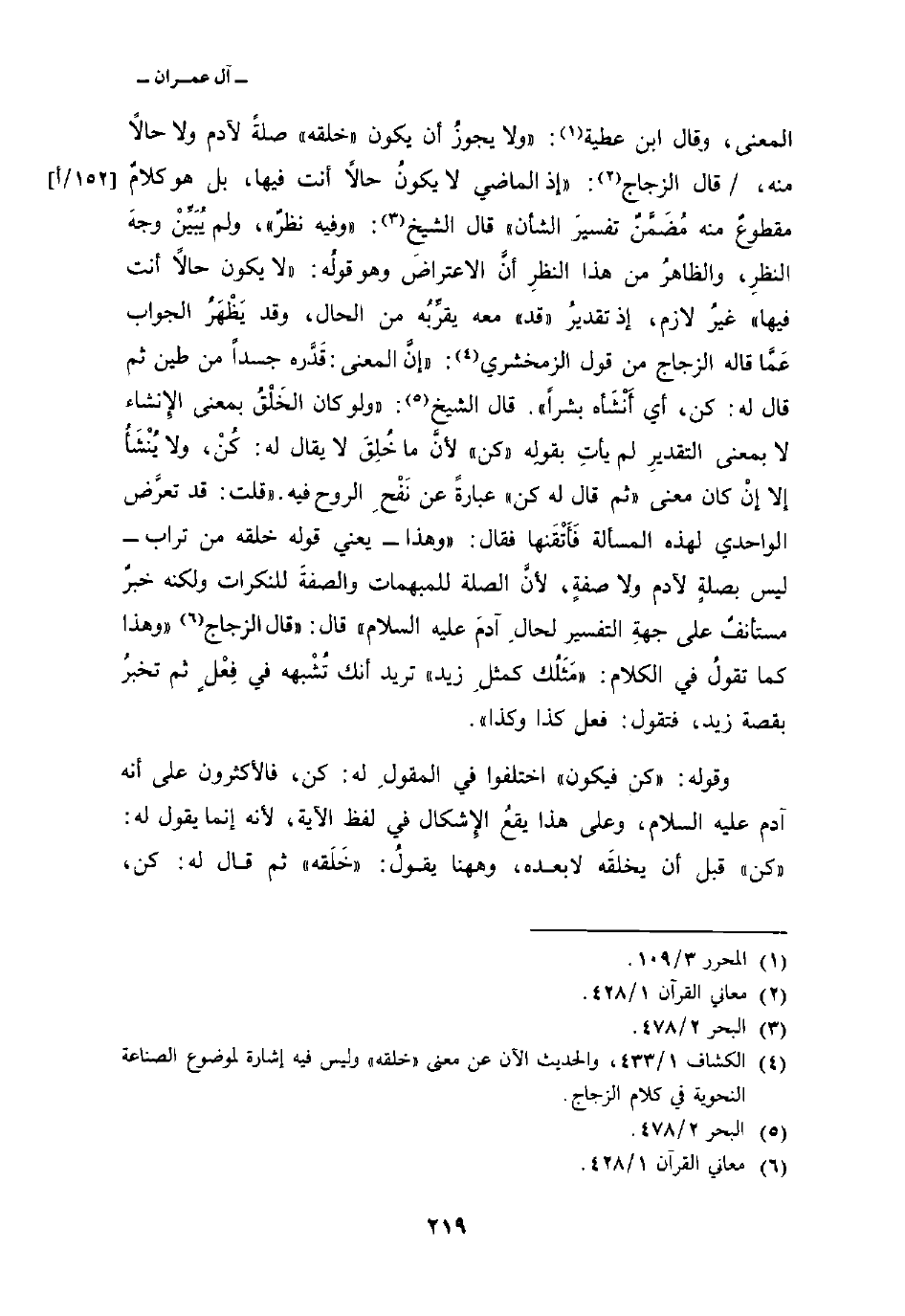 المعنى، وقال ابن عطية: «ولا يجوزُ أن يكون» خلقه «صلةً لآدم ولا حالاً منه، / قال الزجاج:» إذ الماضي لا يكونُ حالاً أنت فيها، بل هو كلامٌ مقطوعٌ منه مُضَمَّنٌ تفسيرَ الشأن «قال الشيخ:» وفيه نظرٌ «، ولم يُبَيِّنْ وجهَ النظرِ، والظاهرُ من هذا النظرِ أنَّ الاعتراضَ وهو قولُه:» لا يكون حالاً أنت فيها «غيرُ لازم، إذ تقديرُ» قد «معه يقرِّبُه من الحال، وقد يَظْهَرُ الجواب عَمَّا قاله الزجاج من قول الزمخشري:» إنَّ المعنى: قَدَّره جسداً من طين ثم قال له: كن، أي أَنْشَأه بشراً «. قال الشيخ:» ولو كان الخَلْقُ بمعنى الإِنشاء لا بمعنى التقديرِ لم يأتِ بقولِه «كن» لأنَّ ما خُلِقَ لا يقال له: كُنْ، ولا يُنْشَأُ إلا إنْ كان معنى «ثم قال له كن» عبارةً عن نَفْخِ الروح فيه. «قلت: قد تعرَّض الواحدي لهذه المسألة فَأَتْقَنها فقال:» وهذا يعني قوله خلقه من تراب ليس بصلةٍ لآدم ولا صفةٍ، لأنَّ الصلة للمبهمات والصفةً للنكرات ولكنه خبرٌ مستأنفٌ على جهةِ التفسير لحالِ آدَمَ عليه السلام «قال:» قال الزجاج «وهذا كما تقولُ في الكلام:» مَثَلُك كمثلِ زيد «تريد أنك تُشْبهه في فِعْلٍ ثم تخبرُ بقصة زيد، فتقول: فعل كذا وكذا» .