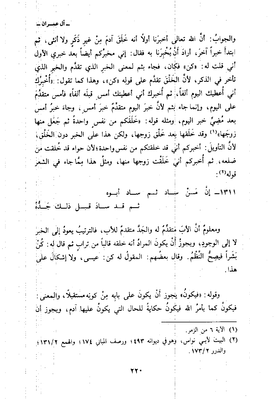 {خَلَقَكُمْ مِّن نَّفْسٍ وَاحِدَةٍ ثُمَّ جَعَلَ مِنْهَا زَوْجَهَا} [الزمر: 6] وقد خَلَقها بعد خَلْق زوجها، ولكن هذا على الخبر دون الخَلْق، لأنَّ التأويلَ: أخبركم أني قد خلقتكم من نفس واحدة؛ لأن حواء قد خُلقت من ضلعه، ثم أُخبركم أني خَلَقت زوجها منها، ومثلُ هذا مِمَّا جاء في الشعر قوله: