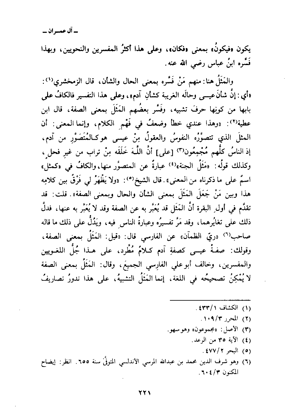 والمَثَلُ هنا: منهم مَنْ فَسَّره بمعنى الحال والشأن، قال الزمخشري: «أي: إنَّ شأنَ عيسى وحالَه الغريبة كشأنِ آدم» ، وعلى هذا التفسير فالكافُ على بابها من كونِها حرفَ تشبيه، وفَسَّر بعضُهم المَثَلَ بمعنى الصفة، قال ابن عطية: «وهذا عندي خطأ وضعفٌ في فَهْمِ الكلام، وإنما المعنى: أن المثلَ الذي تتصوَّرُه النفوسُ والعقولُ مِنْ عيسى هو كالمُتَصَوَّرِ من آدم، إذ الناسُ كلُّهم مُجْمِعُون [على] أنَّ اللهَ خَلَقَه مِنْ تراب من غيرِ فحلٍ، وكذلك قولُه: {مَّثَلُ الجنة} [الرعد: 35] عبارةٌ عن المتصوَّر منها، والكافُ في» كمثل «اسمٌ على ما ذكرناه من المعنى» . قال الشيخ: «ولا يَظْهَرُ لي فَرْقٌ بين كلامِه هذا وبين مَنْ جَعَلَ المَثَلَ بمعنى الشأن والحال وبمعنى الصفة» . قلت: قد تقدَّم في أولِ البقرة أنَّ المَثَل قد يُعَبَّر به عن الصفة وقد لا يُعَبَّر به عنها، فدلَّ ذلك على تغايُرهما، وقد مَرَّ تفسيرُه وعبارةُ الناسِ فيه، ويَدُلُّ على ذلك ما قاله صاحب «ريّ الظمآن» عن الفارسي قال: «قيل: المَثَلُ بمعنى الصفة، وقولك: صفةُ عيسى كصفة آدم كلامٌ مُطَّرد، على هذا جُلُّ اللغويين والمفسرين، وخالف أبو علي الفارِسي الجميعَ، وقال: المَثَلُ بمعنى الصفة لا يُمْكِنُ تصحيحُه في اللغة، إنما المَثَلُ التشبيهُ، على هذا تدورُ تصاريفُ
