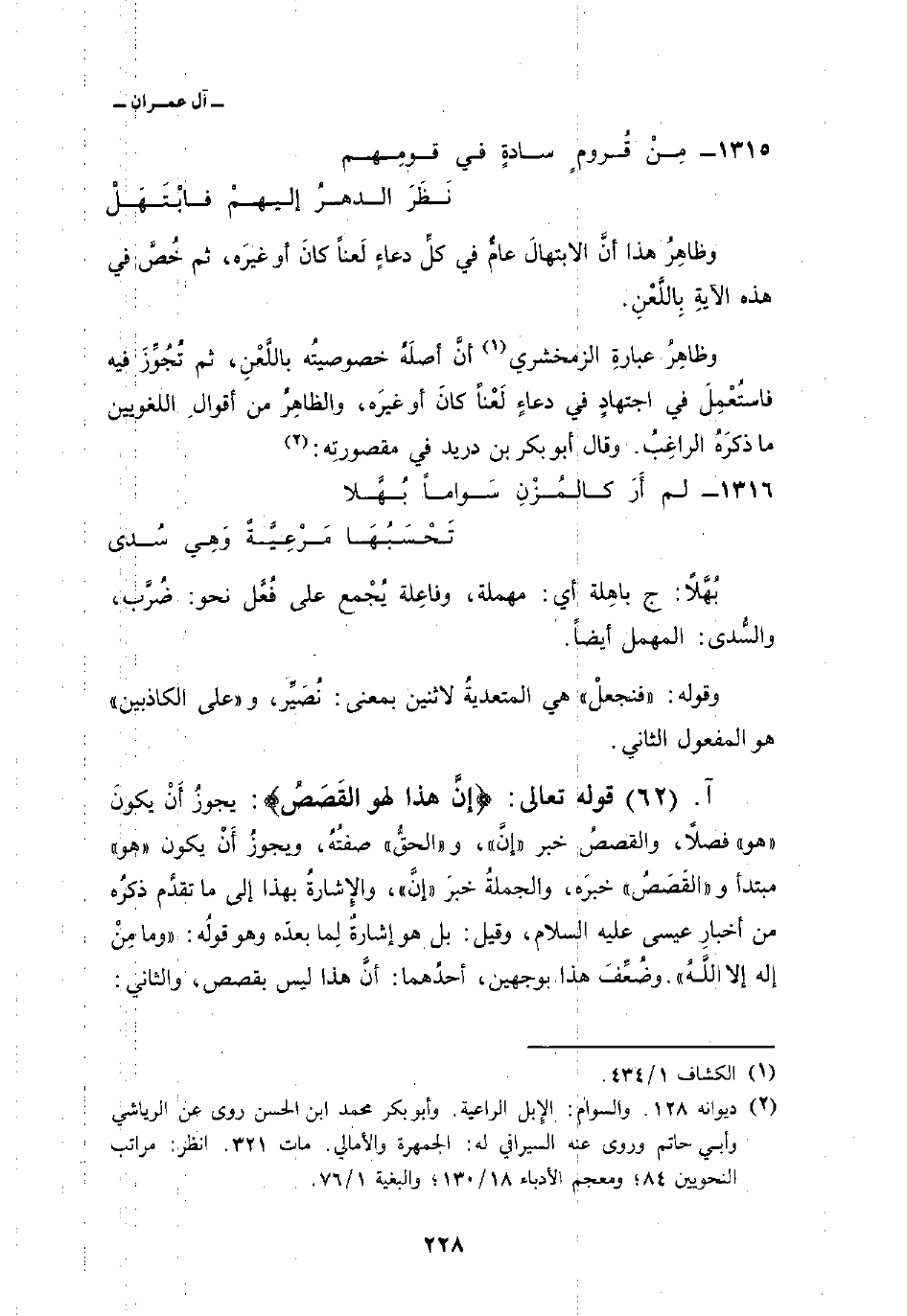 وظاهِرُ عبارةِ الزمخشري أنَّ أصلَهُ خصوصيتُه باللَّعْنِ، ثم تُجُوِّزَ فيه فاستُعْمِلَ في اجتهادٍ في دعاءٍ لَعْناً كانَ أو غيرَه، والظاهِرُ من أقوالِ اللغويين ما ذكرَهُ الراغِبُ. وقال أبو بكر بن دريد في مقصورِته: