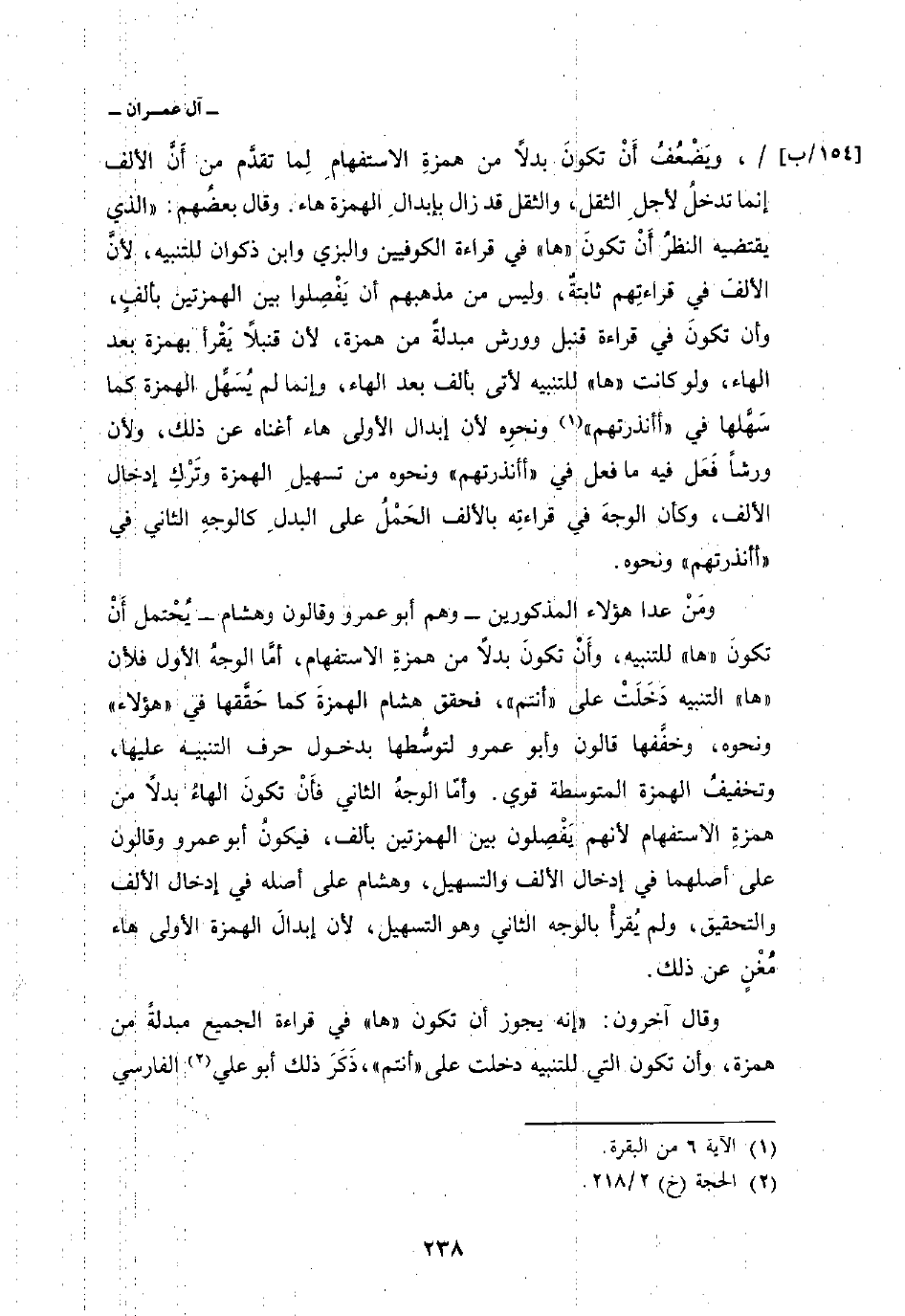 ومَنْ عدا هؤلاء المذكورين وهم أبو عمرو وقالون وهشام يُحْتمل أَنْ تكونَ» ها «للتنبيه، وأَنْ تكونَ بدلاً من همزةِ الاستفهام، أمَّا الوجهُ الأول فلأن» ها «التنبيه دَخَلَتْ على» أنتم «، فحقق هشام الهمزةَ كما حَقَّقها في» هؤلاء «ونحوه، وخفَّفها قالون وأبو عمرو لتوسُّطها بدخول حرف التنبيه عليها، وتخفيفُ الهمزة المتوسطة قوي. وأمّا الوجهُ الثاني فأَنْ تكونَ الهاءُ بدلاً من همزةِ الاستفهام لأنهم يَفْصِلون بين الهمزتين بألف، فيكونُ أبو عمرو وقالون على أصلهما في إدخال الألف والتسهيل، وهشام على أصله في إدخال الألف والتحقيق، ولم يُقرأْ بالوجه الثاني وهو التسهيل، لأن إبدالَ الهمزة الأولى هاء مُغْنٍ عن ذلك.