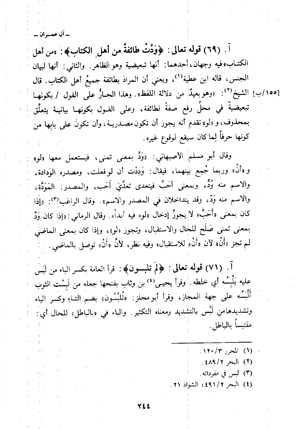 قوله تعالى: {وَدَّت طَّآئِفَةٌ مِّنْ أَهْلِ الكتاب} : {مِّنْ أَهْلِ الكتاب} فيه وجهان: أحدهما: أنها تبعيضية وهو الظاهر. والثاني: أنها لبيان الجنس، قاله ابن عطية، ويعني أن المرادَ بطائفة جميعُ أهل الكتاب. قال الشيخ: «وهو بعيدٌ من دلالة اللفظ» . وهذا الجارُّ على القول/ بكونها تبعيضيةً في محلِّ رفع صفةً لطائفة، وعلى القول بكونها بيانية يتعلَّق بمحذوف، و «لو» تقدم أنه يجوز أن تكون مصدرية، وأن تكونَ على بابِها من كونها حرفاً لِما كان سيقع لوقوع غيره.