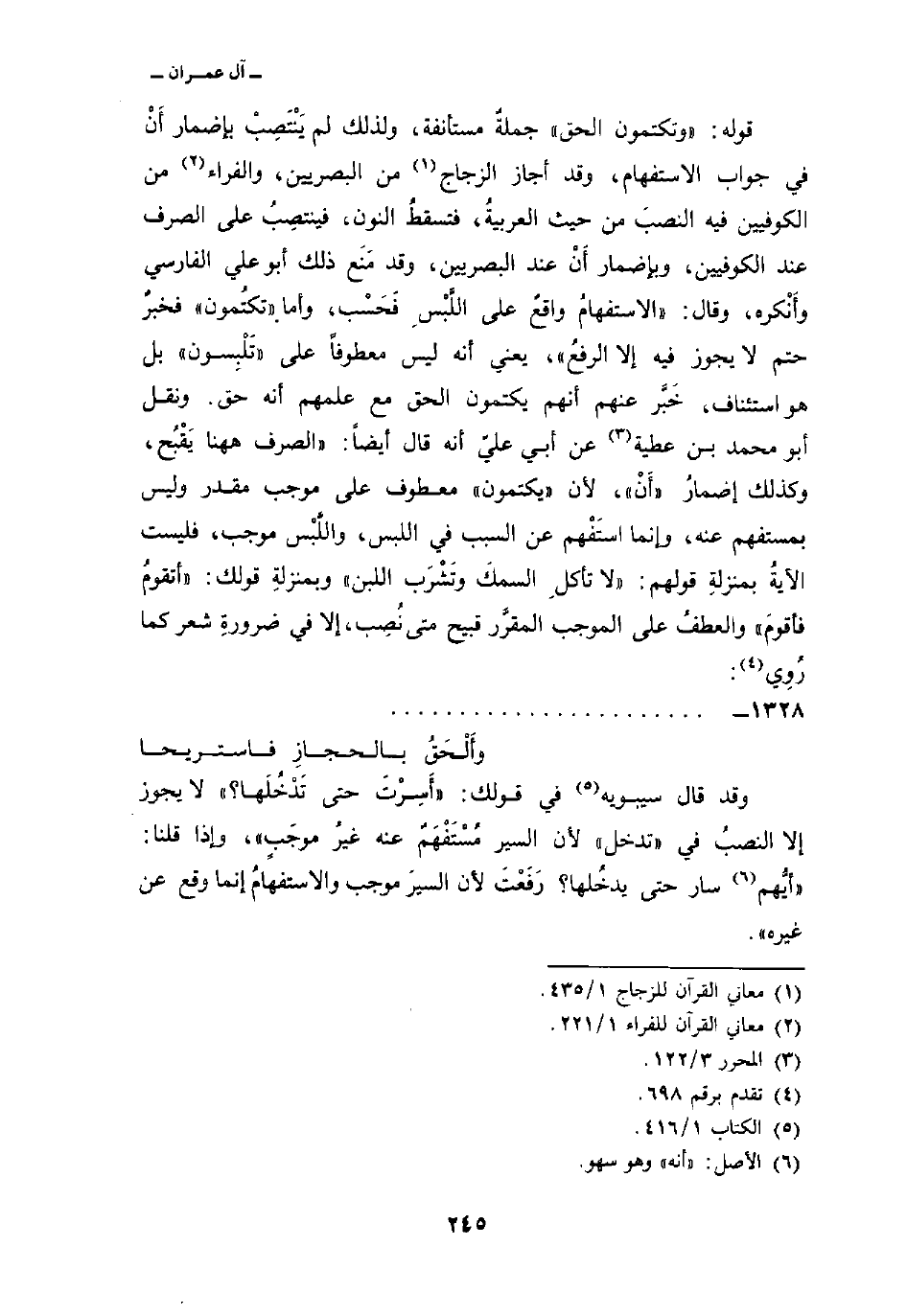 قوله: {وَتَكْتُمُونَ الحق} جملةٌ مستأنفة، ولذلك لم يَنْتَصِبْ بإضمار أَنْ في جواب الاستفهام، وقد أجاز الزجاج من البصريين، والفراء من الكوفيين فيه النصبَ من حيث العربيةُ، فتسقطُ النون، فينتصِبُ على الصرف عند الكوفيين، وبإضمار أَنْ عند البصريين، وقد مَنَع ذلك أبو علي الفارسي وأَنْكره، وقال: «الاستفهامُ واقعٌ على اللَّبْسِ فَحَسْب، وأما» تكتمُون «فخبرٌ حتم لا يجوز فيه إلا الرفعُ» ، يعني أنه ليس معطوفاً على «تَلْبِسون» بل هو استئناف، خَبَّر عنهم أنهم يكتمون الحق مع علمهم أنه حق. ونقل أبو محمد بن عطية عن أبي عليّ أنه قال أيضاً: «الصرف ههنا يَقْبُح، وكذلك إضمارُ» أَنْ «، لأن» يكتمون «معطوف على موجب مقدر وليس بمستفهم عنه، وإنما استَفْهم عن السبب في اللبس، واللَّبْس موجب، فليست الآيةُ بمنزلةِ قولهم:» لا تأكلِ السمكَ وتَشْرَب اللبن «وبمنزلةِ قولك:» أتقومُ فأقومَ «والعطفُ على الموجب المقرَّر قبيح متى نُصِب، إلا في ضرورةِ شعر كما رُوِي: