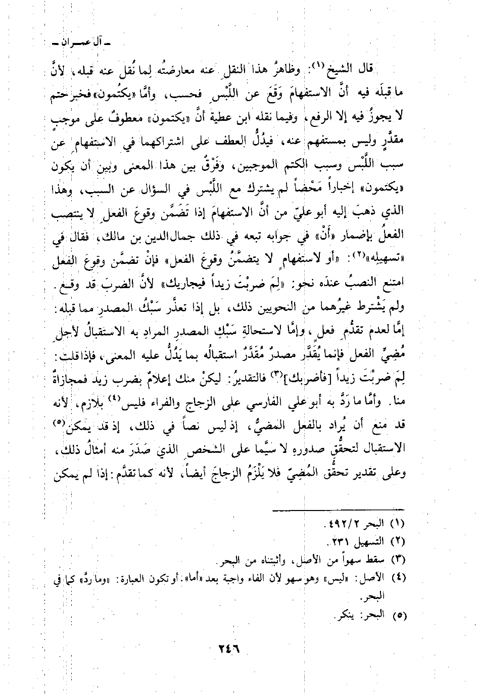 قال الشيخ: وظاهرُ هذا النقلِ عنه معارضتُه لِما نُقل عنه قبله، لأنَّ ما قبلَه فيه أنَّ الاستفهامَ وَقَعَ عن اللَّبْسِ فحسب، وأمَّا «يكتُمون» فخبر حتم لا يجوزُ فيه إلا الرفع، وفيما نقله ابن عطية أنَّ «يكتمون» معطوفٌ على موجبٍ مقدَّرٍ وليس بمستفهم عنه، فيدُلُّ العطف على اشتراكهما في الاستفهامِ عن سبب اللَّبْس وسبب الكتم الموجبين، وفَرْقٌ بين هذا المعنى وبين أن يكون «يكتمون» إخباراً مَحْضاً لم يشترك مع اللَّبْس في السؤال عن السبب، وهذا الذي ذهبَ إليه أبو عليّ من أنَّ الاستفهامَ إذا تَضَمَّن وقوعَ الفعلِ لا ينتصب الفعلُ بإضمار «أَنْ» في جوابه تبعه في ذلك جمال الدين بن مالك، فقال في «تسهيلِه» : «أو لاستفهامٍ لا يتضمَّنُ وقوعَ الفعل» فإنْ تضمَّن وقوعَ الفعل امتنع النصبُ عندَه نحو: «لِمَ ضربْتَ زيداً فيجاريك» لأنَّ الضربَ قد وقع.