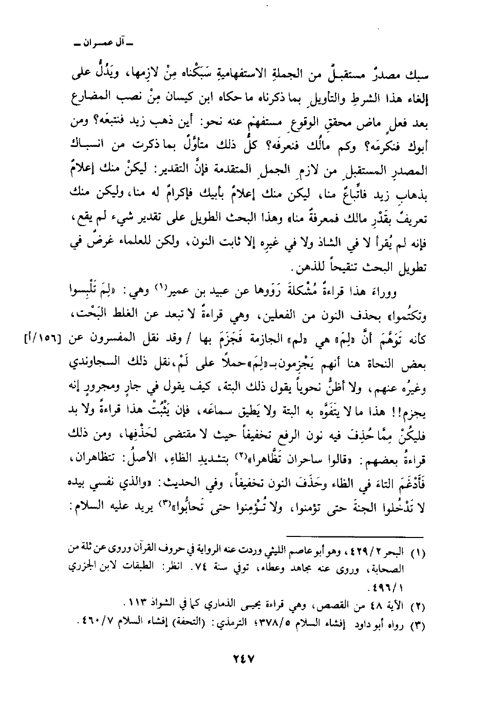 ووراءَ هذا قراءةٌ مُشْكلةَ رَوَوها عن عبيد بن عمير وهي» لِمَ تَلْبِسوا وتكتُموا «بحذف النون من الفعلين، وهي قراءةٌ لا تبعد عن الغلط البَحْت، كأنه تَوَهَّمَ أنَّ» لِمَ «هي» لم «الجازمة فَجَزَمَ بها/ وقد نقل المفسرون عن بعض النحاة هنا أنهم يَجْزِمون ب» لِمَ «حملاً على لَمْ، نقل ذلك السجاوندي وغيرُه عنهم، ولا أظنُّ نحوياً يقول ذلك البتة، كيف يقول في جارٍ ومجرورٍ إنه يجزم!! هذا ما لا يتَفَوَّه به البتة ولا يَطيق سماعَه، فإن يَثْبُتْ هذا قراءةً ولا بد فليكُنْ مِمَّا حُذِفَ فيه نون الرفع تخفيفاً حيث لا مقتضى لحَذْفِها، ومن ذلك قِراءةُ بعضهم: {قَالُواْ ساحران تَظَّاهَرَا} [القصص: 48] بتشديدِ الظاءِ، والأصلُ: تتظاهران، فَأَدْغَمَ التاءَ في الظاء وحَذَفَ النون تخفيفاً، وفي الحديث:» والذي نفسي بيده لا تَدخُلوا الجنةَ حتى تؤمنوا، ولا تُؤمِنوا حتى تَحابُّوا «يريد عليه السلام: