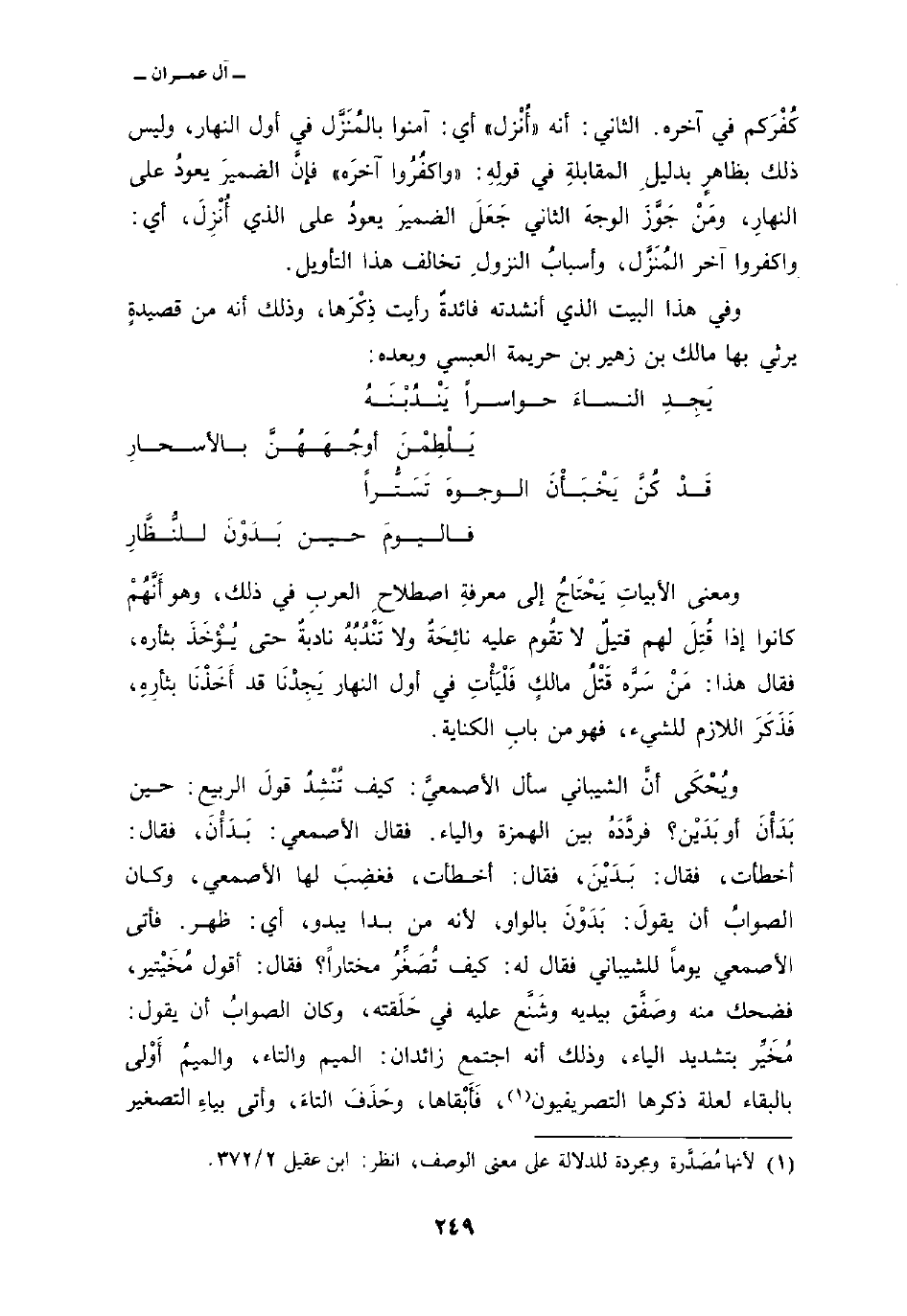 ويُحْكَى أنَّ الشيباني سأل الأصمعيَّ: كيف تُنْشِدُ قولَ الربيع: حين بَدَأْنَ أو بَدَيْن؟ فردَّدَهُ بين الهمزة والياء. فقال الأصمعي: بَدَأْنَ، فقال: أخطأت، فقال: بَدَيْنَ، فقال: أخطأت فغضِبَ لها الأصمعي، وكان الصوابُ أن يقولَ: بَدَوْنَ بالواو، لأنه من بدا يبدو، أي: ظهر. فأتى الأصمعي يوماً للشيباني فقال له: كيف تُصَغِّرُ مختاراً؟ فقال: أقول مُخَيْتير، فضحك منه وصَفَّق بيديه وشَنَّع عليه في حَلَقته، وكان الصوابُ أن يقول: مُخَيِّر بتشديد الياء، وذلك أنه اجتمع زائدان: الميم والتاء، والميمُ أَوْلى بالبقاء لعلة ذكرها التصريفيون، فَأَبْقاها، وحَذَفَ التاءَ، وأتى بياءِ التصغير