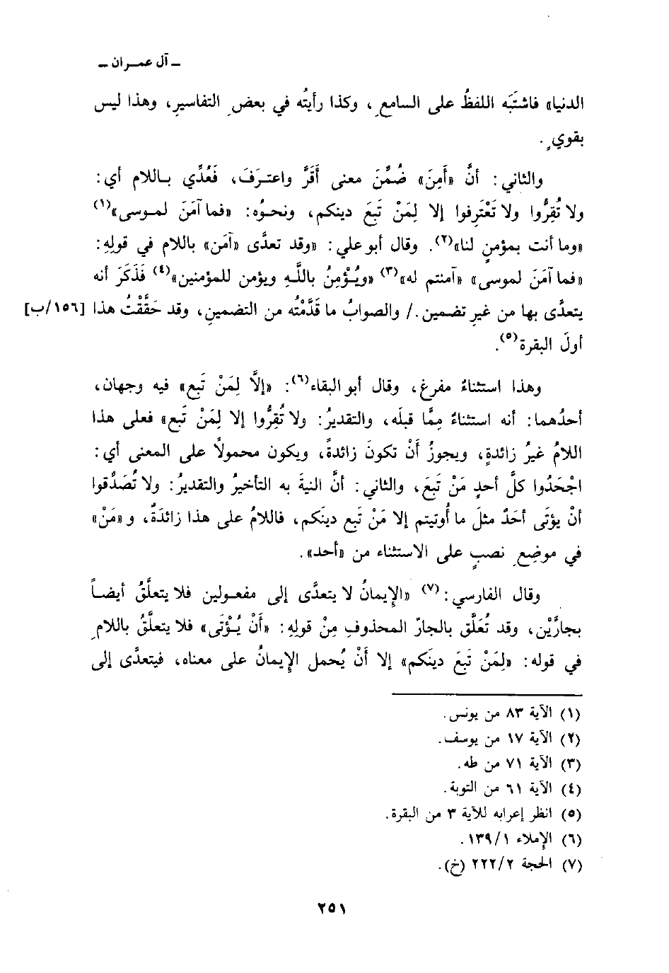 وقال الفارسي: «الإِيمانُ لا يتعدَّى إلى مفعولين فلا يتعلَّقُ أيضاً بجارَّيْن، وقد تُعَلَّق بالجارّ المحذوفِ مِنْ قولِهِ: {أَن يؤتى} فلا يتعلَّقُ باللامِ في قوله: {لِمَن تَبِعَ دِينَكُمْ} إلا أَنْ يُحمل الإِيمانُ على معناه، فيتعدَّى إلى