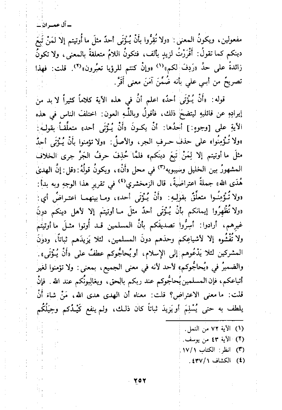 قوله: {أَن يؤتى أَحَدٌ} اعلم أنَّ في هذه الآية كلاماً كثيراً لا بد من إيرادِهِ عن قائليهِ ليتضحَ ذلك، فأقولُ وباللهِ العون: اختلفَ الناس في هذه الآيةِ على [وجوهٍ:] أحدُها: أنْ يكونَ {أَن يؤتى أَحَدٌ} متعلِّقاً بقوله: {وَلاَ تؤمنوا} على حذف حرفِ الجر، والأصلُ: «ولاتؤمنوا بأَنْ يُؤْتَى أحدٌ مثلَ ما أوتيتم إلا لِمَنْ تَبعَ دينَكم» فلمَّا حُذِفَ حرفُ الجَرِّ جرى الخلاف المشهورُ بين الخليل وسيبويه في محل «أَنْ» ، ويكونُ قولُهُ: {قُلْ إِنَّ الهدى هُدَى الله} جملةً اعتراضيةً، قال الزمخشري في تقريرِ هذا الوجهِ وبه بدأ: «ولا تُؤْمِنُوا متعلِّقٌ بقولِهِ:» أَنْ يُؤْتَى أحد «، وما بينهما اعتراضٌ أي:» ولا تُظْهِرُوا إيمانكم بأنْ يُؤْتَى أحدٌ مثلَ ما أوتيتم إلا لأهل دينكم دونَ غيرِهم، أرادوا: أسِرُّوا تصديقَكم بأنَّ المسلمين قد أُوتوا مثلَ ما أوتيتم ولا تُفْشُوه إلا لأشياعِكم وحدَهم دونَ المسلمين، لئلا يَزيدَهم ثباتاً، ودونَ المشركين لئلا يَدْعُوهم إلى الإِسلام، أو يُحاجُّوكم عطفٌ على «أَنْ يُؤْتَى» .