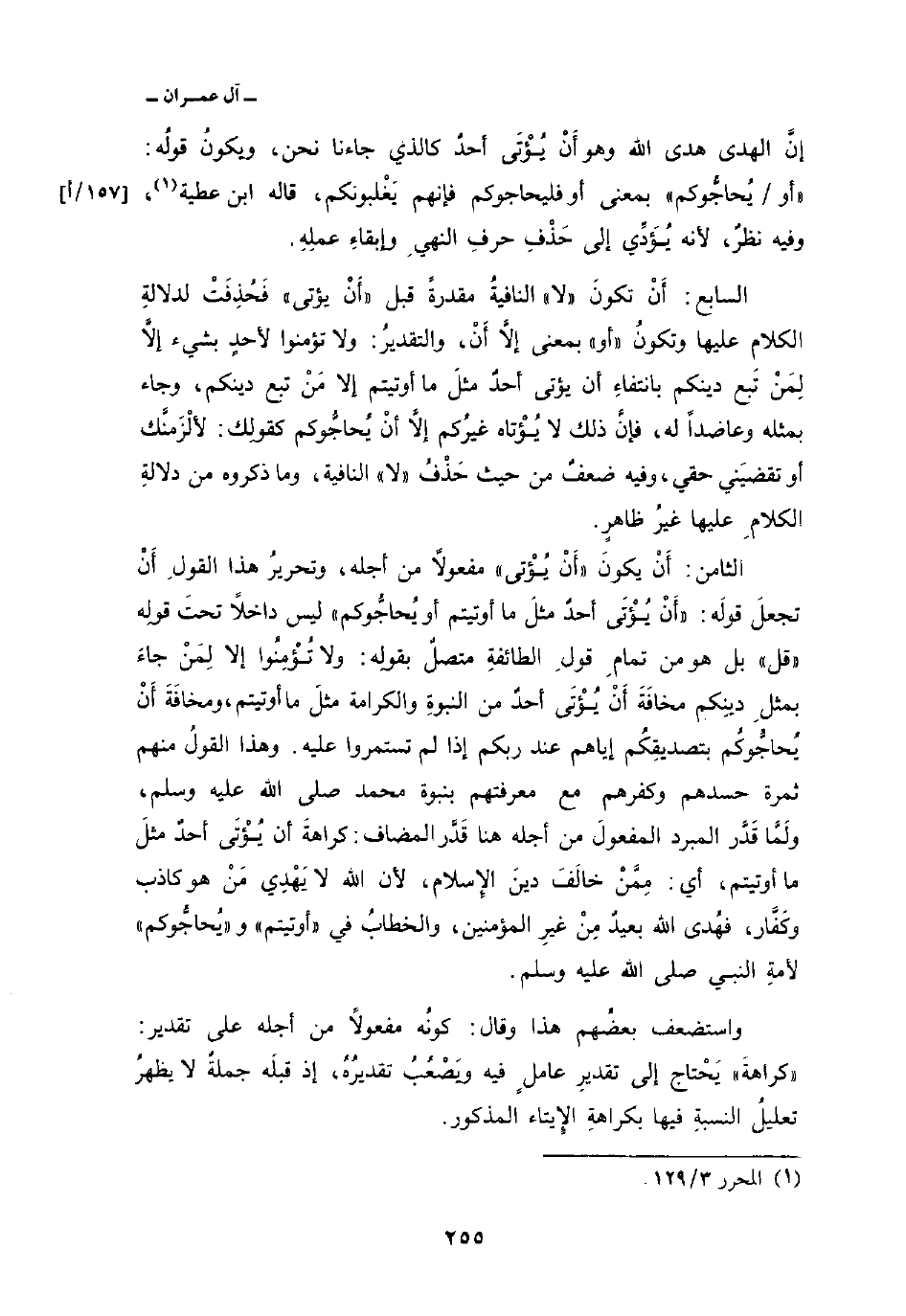 الثامن: أَنْ يكونَ «أَنْ يُؤْتى» مفعولاً من أجله، وتحريرُ هذا القولِ أَنْ تجعلَ قولَه: {أَن يؤتى أَحَدٌ مِّثْلَ مَآ أُوتِيتُمْ أَوْ يُحَآجُّوكُمْ} ليس داخلاً تحتَ قولِه «قل» بل هو من تمامِ قول الطائفةِ متصلٌ بقولِه: ولا تُؤمِنُوا إلا لِمَنْ جاءَ بمثلِ دينِكم مخافَةَ أَنْ يُؤْتى أحدٌ من النبوةِ والكرامة مثلَ ما أوتيتم، ومخافَةَ أَنْ يُحاجُّوكُم بتصديقِكُم إياهم عند ربكم إذا لم تستمروا عليه. وهذا القولُ منهم ثمرة حسدهم وكفرهم مع معرفتهم بنبوة محمد صَلَّى اللهُ عَلَيْهِ وَسَلَّمَ، ولَمَّا قَدَّر المبرد المفعولَ من أجله هنا قَدَّر المضاف: كراهَة أن يُؤتَى أحدٌ مثلَ ما أوتيتم، أي: مِمَّن خالَفَ دينَ الإِسلام، لأن الله لا يَهْدِي مَنْ هو كاذب وكَفَّار، فهُدى الله بعيدٌ مِنْ غيرِ المؤمنين، والخطابُ في «أوتيتم» و «يُحاجُّوكم» لأمةِ النبي صَلَّى اللهُ عَلَيْهِ وَسَلَّمَ.