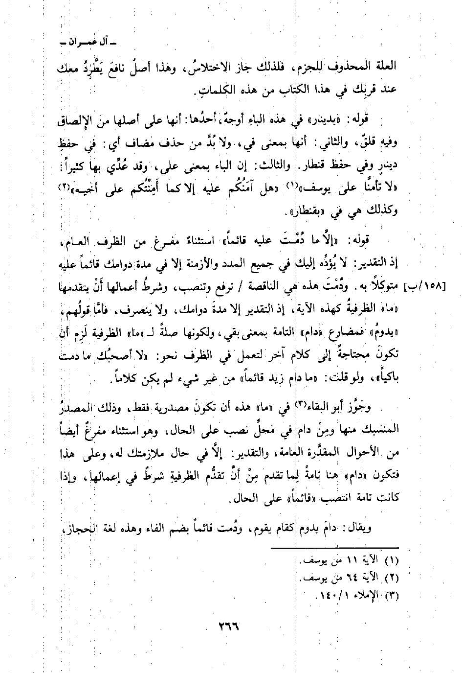 قوله: {إِلاَّ مَا دُمْتَ عَلَيْهِ قَآئِماً} استثناءٌ مفرغ من الظرف العام، إذا التقدير: لا يُؤدِّه إليك في جميع المدد والأزمنة إلا في مدة دوامك قائماً عليه متوكلاً به. ودُمْتَ هذه هي الناقصة/ ترفع وتنصب، وشرطُ إعمالها أَنْ يتقدمها «ما» الظرفيةُ كهذه الآية، إذ التقدير إلا مدةَ دوامك، ولا يتصرف، فأمَّا قولُهم، «يدومُ» فمضارع «دام» التامة بمعنى بقي، ولكونها صلةً ل «ما» الظرفية لَزِم أن تكونَ محتاجةً إلى كلام آخر لتعمل في الظرف نحو: «لا أصحبُك ما دمت باكياً» ، ولو قلت: «ما دام زيد قائماً» من غير شيء لم يكن كلاماً.