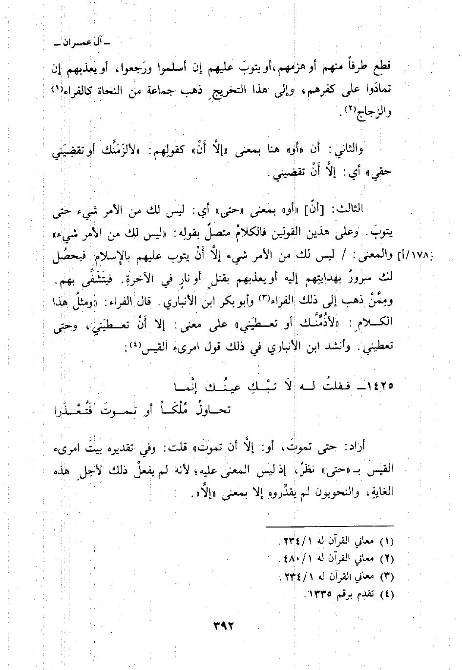 الثالث: [أنّ] «أو» بمعنى «حتى» أي: ليس لك من الأمر شيء حتى يتوبَ. وعلى هذين القولين فالكلامُ متصلٌ بقولِه: «ليس لك من الأمر شيء» والمعنى: / ليس لك من الأمر شيء إلاَّ أَنْ يتوب عليهم بالإِسلامِ فيحصُل لك سرورٌ بهدايتِهم إليه أو يعذبهم بقتلٍ أو نارٍ في الآخرةِ. فيتَشَفَّى بهم. ومِمَّنْ ذهب إلى ذلك الفراء وأبو بكر ابن الأنباري. قال الفراء: «ومثلُ هذا الكلامِ:» لأُذَمَّنَّك أو تعطيَني «على معنى: إلا أَنْ تعطيَني، وحتى تعطيني. وأنشد ابن الأنباري في ذلك قول امرىء القيس: