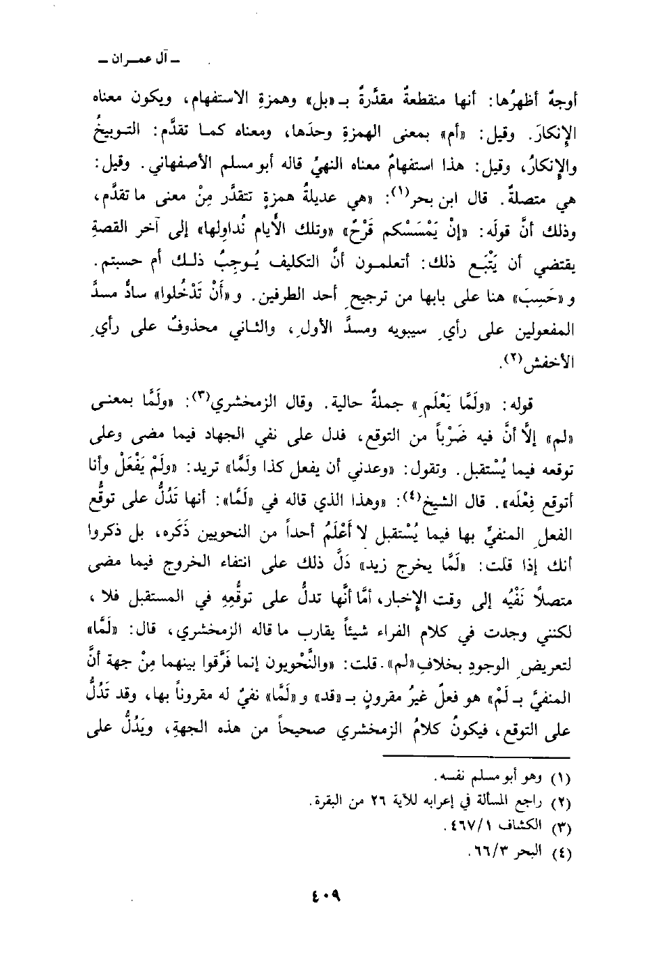 قوله: {وَلَمَّا يَعْلَمِ} جملةٌ حالية. وقال الزمخشري:» ولَمَّا بمعنى «لم» إلاَّ أنَّ فيه ضَرْباً من التوقع، فدل على نفي الجهاد فيما مضى وعلى توقعه فيما يُستقبل. وتقول: «وعدني أن يفعل كذا ولَمَّا» تريد: «ولَمْ يَفْعَلُ وأنا أتوقع فِعْلَه» . قال الشيخ: «وهذا الذي قاله في» لَمَّا «: أنها تَدُلُّ على توقُّع الفعلِ المنفيِّ بها فيما يُستقبل لا أَعْلَمُ أحداً من النحويين ذَكَره، بل ذكروا أنك إذا قلتَ:» لَمَّا يخرج زيد «دَلَّ ذلك على انتفاء الخروج فيما مضى متصلاً نَفْيُه إلى وقت الإِخبار، أمَّا أنَّها تدلُّ على توقُّعِهِ في المستقبل فلا، لكنني وجدت في كلام الفراء شيئاً يقارب ما قاله الزمخشري، قال:» لَمَّا «لتعريضِ الوجودِ بخلافِ» لم «» . قلت: «والنَّحْويون إنما فَرَّقوا بينهما مِنْ جهة أنَّ المنفيَّ ب لَمْ» هو فعلٌ غيرُ مقرونٍ ب «قد» و «لَمَّا» نفيٌ له مقروناً بها، وقد تَدُلُّ على التوقع، فيكونُ كلامُ الزمخشري صحيحاً من هذه الجهةِ، ويَدُلُّ على