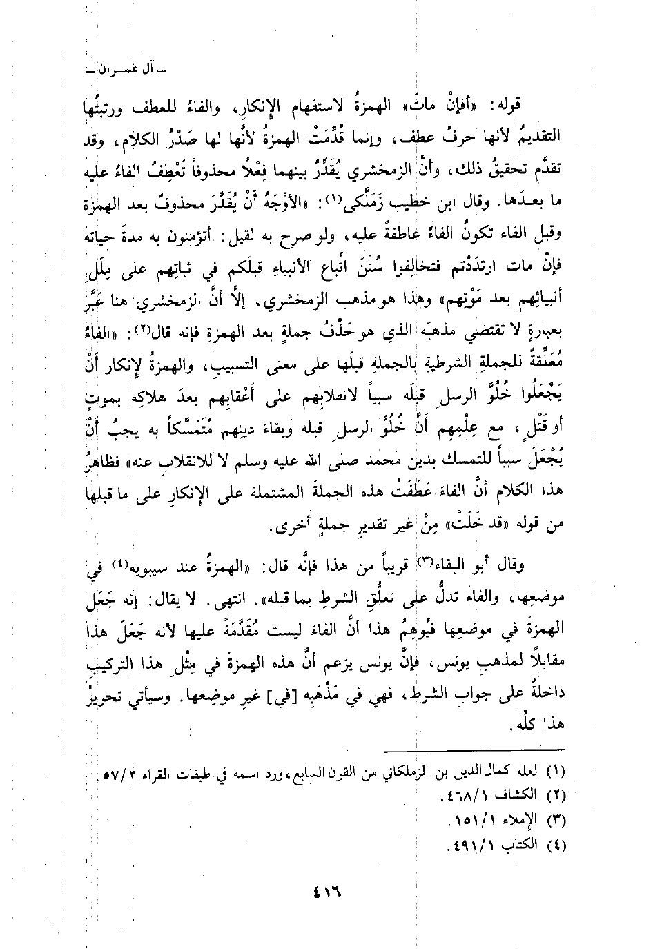 وقال ابن خطيب زَمَلَّكى: «الأوْجَهُ أَنْ يُقَدَّرَ محذوفٌ بعد الهمزة وقيل الفاء تكونُ الفاءُ عاطفةً عليه، ولو صرح به لقيل: أتؤمنون به مدةَ حياته فإنْ مات ارتدَدْتم فتخالِفوا سُنَنَ اتِّباع الأنبياءِ قبلَكم في ثباتِهم على مِلَلِ أنبيائِهم بعد مَوْتِهم» وهذا هو مذهب الزمخشري، إلاَّ أنَّ الزمخشري هنا عَبَّر بعبارةٍ لا تقتضي مذهبَه الذي هو حَذْفُ جملةٍ بعد الهمزةِ فإنه قال: «الفاءُ مُعَلَّقةٌ للجملةِ الشرطيةِ بالجملةِ قبلَها على معنى التسبيبِ، والهمزةُ لإِنكار أَنْ يَجْعَلُوا خُلُوَّ الرسلِ قبلَه سبباً لانقلابِهم على أَعْقابِهم بعدَ هلاكِه بموتٍ أو قَتْلٍ، مع عِلْمِهِم أَنَّ خُلُوَّ الرسلِ قبله وبقاءَ ديِنهم مُتَمَسَّكاً به يجبُ أَنْ يُجْعَلَ سبباً للتمسك بدين محمد صَلَّى اللهُ عَلَيْهِ وَسَلَّمَ لا للانقلابِ عنه» فظاهرُ هذا الكلام أنَّ الفاءَ عَطَفَتْ هذه الجملةَ المشتملة على الإِنكارِ على ما قبلها من قوله: {قَدْ خَلَتْ} مِنْ غير تقديرِ جملةٍ أخرى.