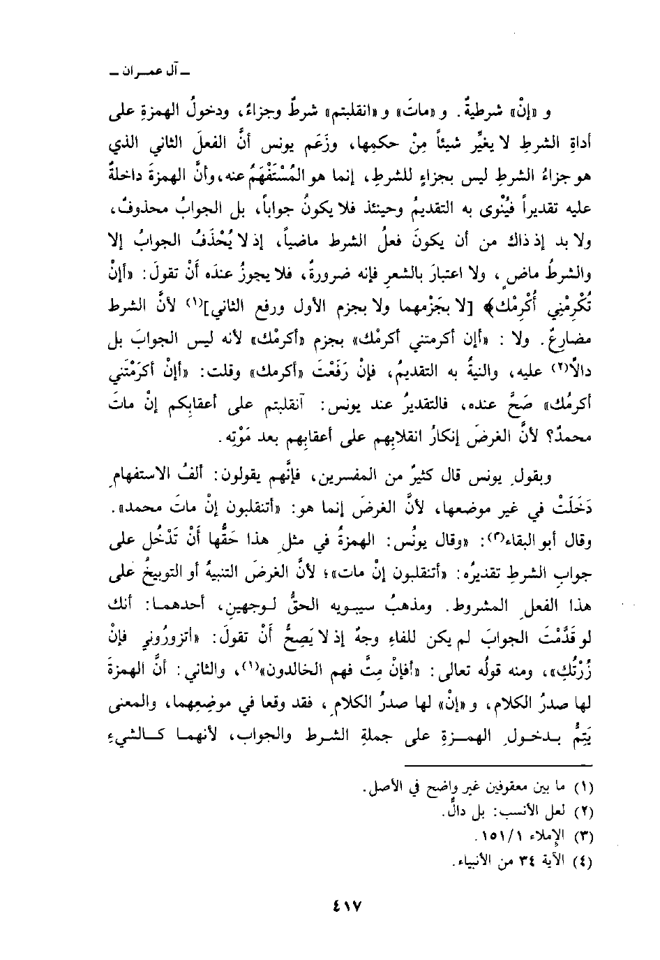 وبقولِ يونس قال كثيرٌ من المفسرين، فإنَّهم يقولون: ألفُ الاستفهامِ دَخَلَتْ في غير موضعها، لأنَّ الغرضَ إنما هو: أتنقلبون إنْ ماتَ محمد «. وقال أبو البقاء:» وقال يونُس: الهمزةُ في مثلِ هذا حَقُّها أَنْ تَدْخُلِ على جوابِ الشرطِ تقديرُه: «أتنقلبون إنْ مات» ؛ لأنَّ الغرضَ التنبيهُ أو التوبيخُ على هذا الفعلِ المشروط.