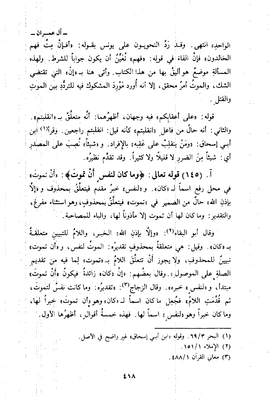 قوله تعالى: {وَمَا كَانَ لِنَفْسٍ أَنْ تَمُوتَ} : «أًَنْ تموتَ» في محل رفع اسماً ل «كان» . و: «لنفس» خبرٌ مقدم فيتعلَّقُ بمحذوف و {إِلاَّ بِإِذْنِ الله} حالٌ من الضمير في «تموت» فيتعلَّقُ بمحذوفٍ، وهو استثناء مفرغ، والتقدير: وما كان لها أن تموت إلا مأذوناً لها، والباء للمصاحبة.