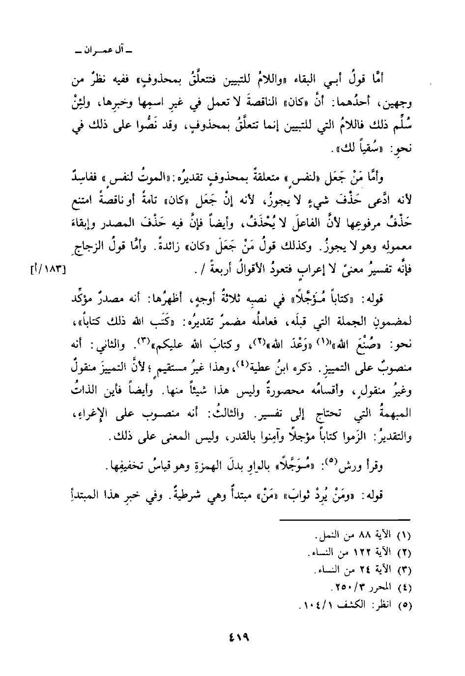 قوله: {كِتَاباً مُّؤَجَّلاً} في نصبِه ثلاثةُ أوجهٍ، أظهرُها: أنه مصدرٌ مؤكِّد لمضمونِ الجملة التي قبلَه، فعاملُه مضمرٌ تقديرُه:» كَتَب الله ذلك كتاباً «، نحو: {صُنْعَ الله} [النمل: 88] {وَعْدَ الله} [النساء: 122] ، و {كِتَابَ الله عَلَيْكُمْ} [النساء: 24] . والثاني: أنه منصوبٌ على التمييزِ. ذكره ابنُ عطية، وهذا غيرُ مستقيمٍ؛ لأنَّ التمييزَ منقولٌ وغيرُ منقولٍ، وأقسامُه محصورةٌ وليس هذا شيئاً منها. وأيضاً فأين الذاتُ المبهمةُ التي تحتاج إلى تفسير. والثالثُ: أنه منصوب على الإِغراءِ، والتقديرُ: الزَموا كتاباً مؤجلاً وآمِنوا بالقدر، وليس المعنى على ذلك.