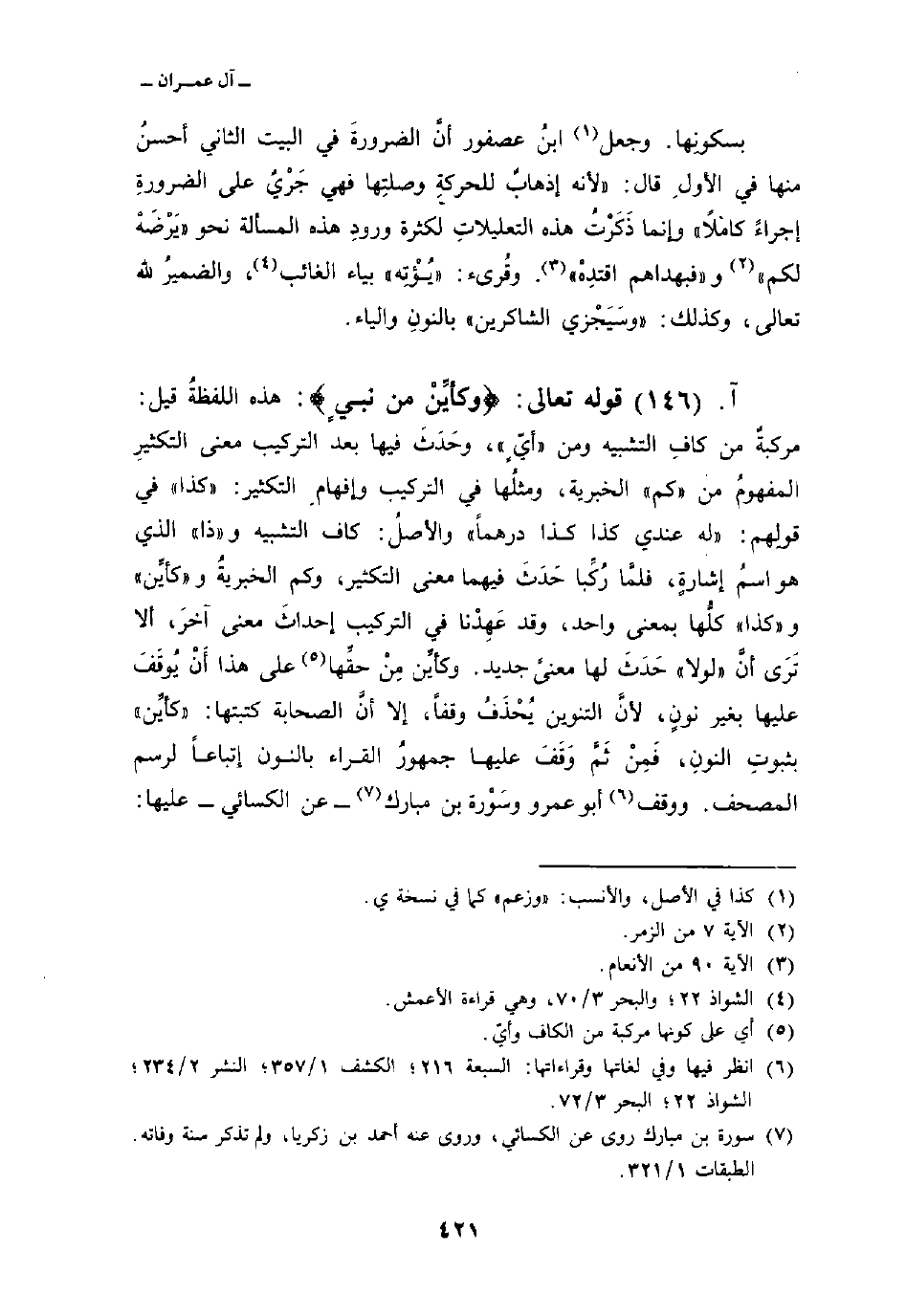 قوله تعالى: {وَكَأَيِّن مِّن نَّبِيٍّ} : هذه اللفظةُ قيل: مركبةٌ من كافِ التشبيه ومن «أيٍّ» ، وحَدَثَ فيه بعد التركيب معنى التكثيرِ المفهومُ من «كم» الخبرية، ومثلُها في التركيب وإفهامِ التكثير: «كذا» في قولِهم: «له عندي كذا كذا درهماً» والأصلُ: كاف التشبيه و «ذا» الذي هو اسمُ إشارةٍ، فلمَّا رُكِّبا حَدَثَ فيهما معنى التكثير، وكم الخبريةُ و «كأيِّن» و «كذا» كلُّها بمعنى واحد، وقد عَهِدْنا في التركيب إحداثَ معنى أخرَ، ألا تَرَى أنَّ «لولا» حَدَثَ لها معنىً جديد. وكأيِّن مِنْ حقِّها على هذا أَنْ يُوقَفَ عليها بغير نونٍ، لأنَّ التنوين يُحْذَفُ وقفاً، إلا أنَّ الصحابة كتبتها: «كأيِّن» بثبوتِ النونِ، فَمِنْ ثَمَّ وَقَفَ عليهما جمهورُ القراء بالنون إتباعاً لرسم المصحف. ووقف أبو عمرو وسَوْرة بن مبارك عن الكسائي عليها: «