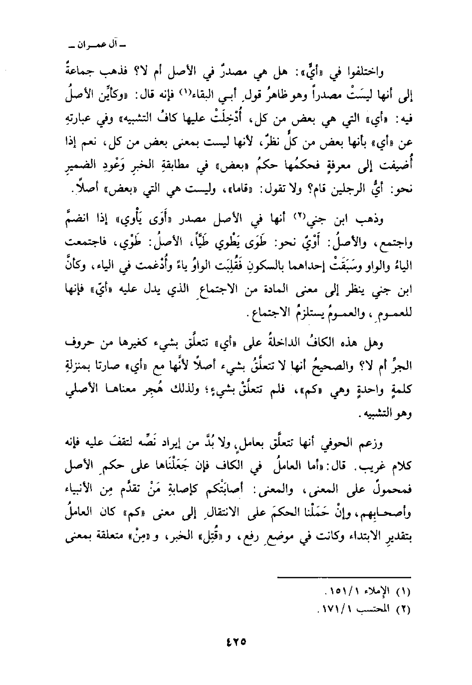 واختلفوا في «أيٍّ» : هل هي مصدرٌ في الأصل أم لا؟ فذهب جماعةٌ إلى أنها ليسَتْ مصدراً وهو ظاهرُ قولِ أبي البقاء فإنه قال: «وكأيِّن الأصلُ فيه:» أي «التي هي بعض من كل، أُدْخِلَتْ عليها كافُ التشبيه» وفي عبارتهِ عن «أي» بأنها بعض من كلٍّ نظرٌ، لأنها ليست بمعنى بعض من كل، نعم إذا أُضيفت إلى معرفةٍ فحكمُها حكمُ «بعض» في مطابقةِ الخبرِ وَعُودِ الضميرِ نحو: أيُّ الرجلين قام؟ ولا تقول: «قاما» ، وليست هي التي «بعض» أصلاً.