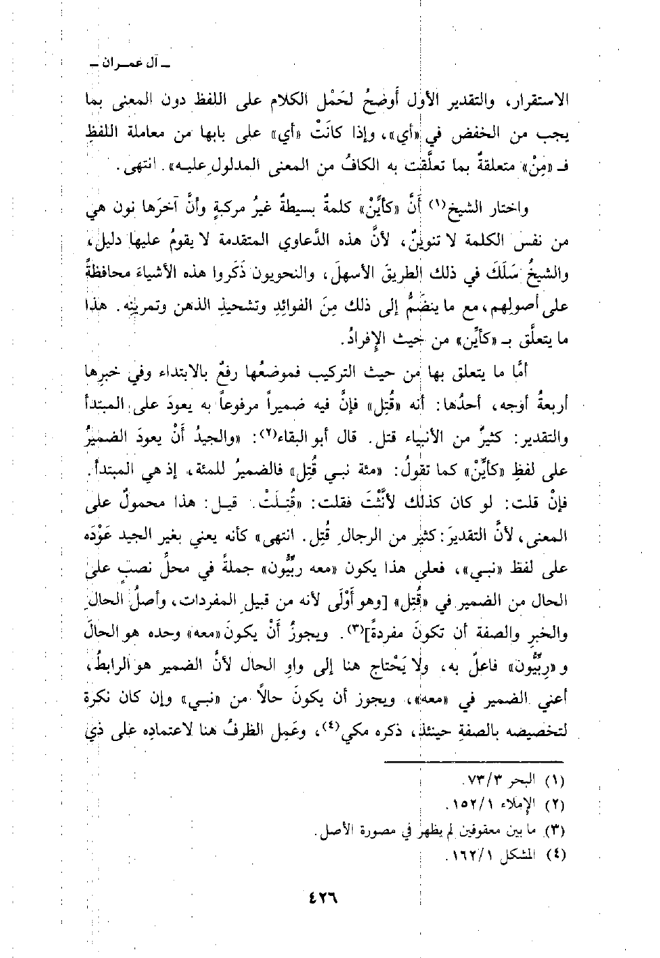 أمَّا ما يتعلق بها من حيث التركيب فموضعُها رفعٌ بالابتداء وفي خبرِها أربعةُ أوجه، أحدُها: أنه» قُتِل «فإنَّ فيه ضميراً مرفوعاً به يعودَ على المبتدأ والتقدير: كثيرٌ من الأنبياء قتل. قال أبو البقاء:» والجيدُ أَنْ يعودَ الضميرُ على لفظِ «كأيِّنْ» كما تقولُ: «مئة نبي قُتِل» فالضميرُ للمئة، إذ هي المبتدأ. فإنْ قلت: لو كان كذلك لأنَّثْتَ فقلت: «قُتِلَتْ. قيل: هذا محمولٌ على المعنى، لأنَّ التقديرَ: كثير من الرجال قُتِل. انتهى» كأنه يعني بغير الجيد عَوْدَه على لفظ «نبي» ، فعلى هذا يكون «معه ربِّيُّون» جملةً في محلِّ نصبٍ على الحال من الضمير في «قُتِل» [وهو أَوْلَى لأنه من قبيلِ المفردات، وأصلُ الحالِ والخبرِ والصفة أن تكونَ مفردةً] . ويجوزُ أَنْ يكونَ «معه» وحده هو الحالَ و «رِبِّيُّون» فاعلٌ به، ولا يَحْتاج هنا إلى واوِ الحال لأنَّ الضمير هو الرابطُ، أعني الضمير في «معه» ، ويجوز أن يكونَ حالاً من «نبي» وإن كان نكرة لتخصيصه بالصفةِ حينئذ، ذكره مكي، وعَمِل الظرفُ هنا لاعتمادِه على ذي
