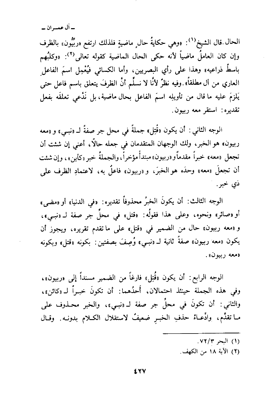 الوجه الرابع: أن يكون «قُتِل» فارغاً من الضمير مسنداً إلى «ربيون» ، وفي هذه الجملة حينئذ احتمالان، أَحدُهما: أن تكونَ خبراً ل «كائن» ، والثاني: أن تكونَ في محلِّ جر صفة ل «نبي» ، والخبر محذوف على ما تقدَّم، وادِّعاءُ حذفِ الخبرِ ضعيفٌ لاستقلال الكلام بدونه. وقال