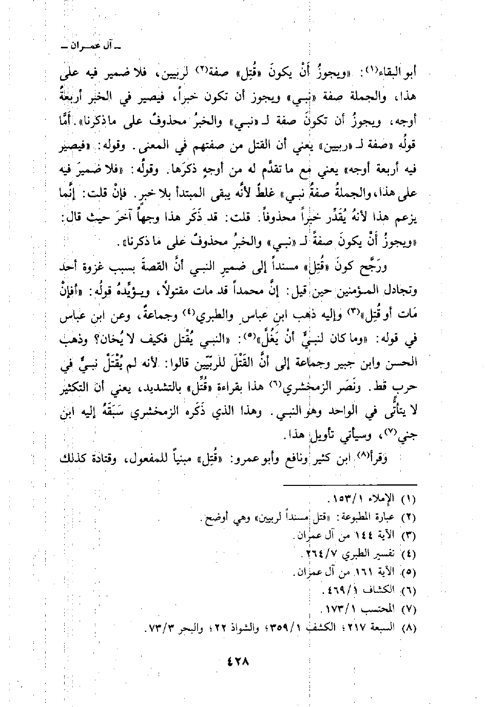 ورَجَّح كونَ «قُتِل» مسنداً إلى ضميرِ النبي أنَّ القصةَ بسبب غزوة أحد وتجادل المؤمنين حين قيل: إنَّ محمداً قد مات مقتولاً، ويؤيِّدهُ قولُه: {أَفإِنْ مَّاتَ أَوْ قُتِلَ} [آل عمران: 144] وإليه ذهب ابن عباسِ والطبري وجماعةٌ، وعن ابن عباس في قوله: {وَمَا كَانَ لِنَبِيٍّ أَنْ يَغُلَّ} [آل عمران: 161] : «النبي يُقْتل فكيف لا يُخان. وذهب الحسن وابن جبير وجماعة إلى أنَّ القَتْلَ للربّيّين قالوا: لأنه لم يُقْتَل نبيٌّ في حربٍ قط. ونَصَر الزمخشري هذا بقراءة» قُتِّل «بالتشديد، يعني أن التكثير لا يتأتَّى في الواحد وهو النبي. وهذا الذي ذَكَره الزمخشري سَبَقَهُ إليه ابن جني، وسيأتي تأويل هذا.