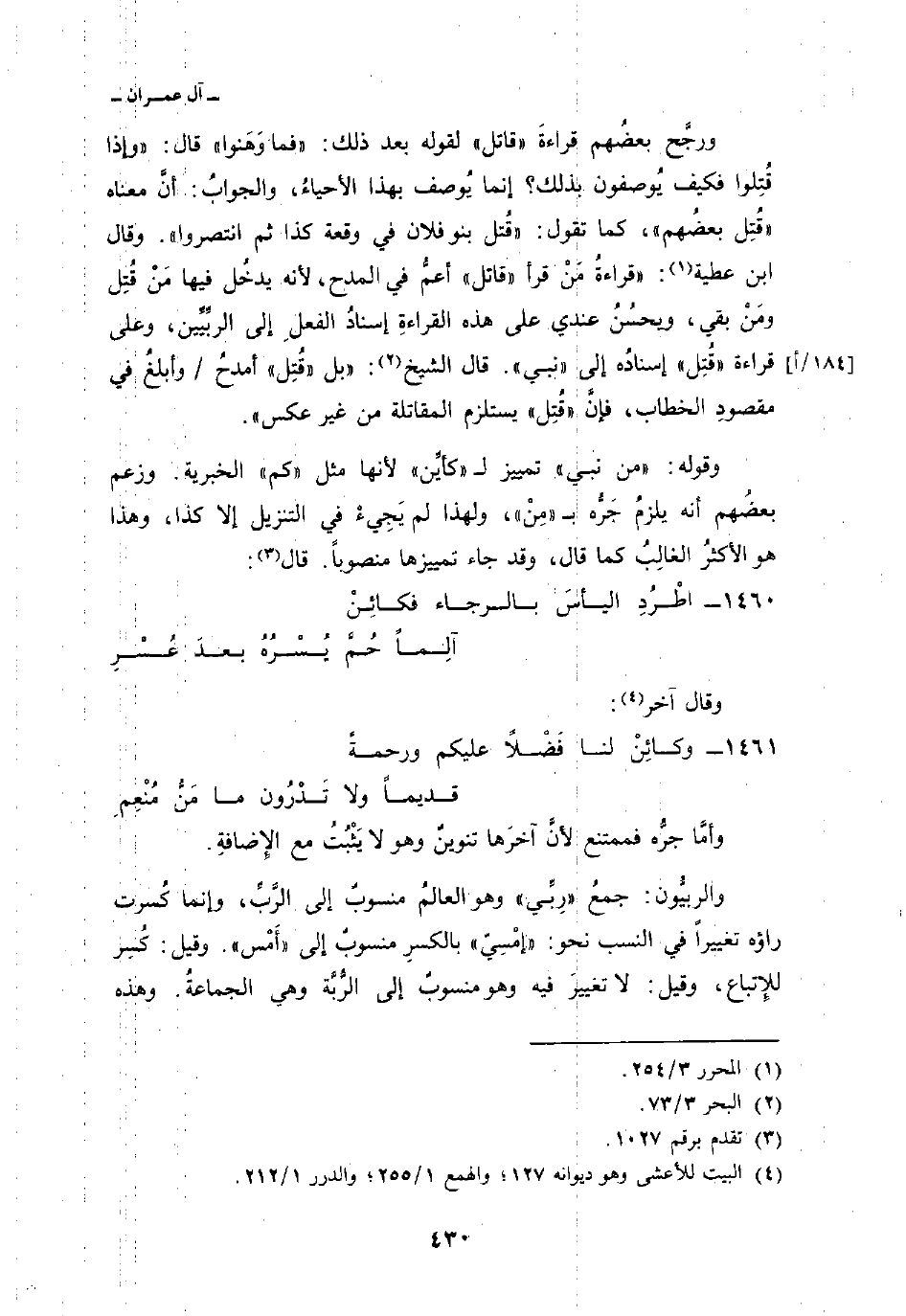 ورجَّح بعضُهم قراءةَ «قاتل» لقوله بعد ذلك: {فَمَا وَهَنُواْ} قال: «وإذا قُتِلوا فكيف يُوصفون بذلك؟ إنما يُوصف بهذا الأحياءُ، والجوابُ: أنَّ معناه» قُتِل بعضُهم «، كما تقول:» قُتل بنو فلان في وقعة كذا ثم انتصروا «. وقال ابن عطية:» قراءةُ مَنْ قرأ «قاتل» أعمُّ في المدح، لأنه يدخُل فيها مَنْ قُتِل ومَنْ بقي، ويحسُنُ عندي على هذه القراءةِ إسنادُ الفعلِ إلى الربِّيِّين، وعلى قراءة «قُتِل» إسنادُه إلى «نبي» . قال الشيخ: «بل» قُتِل «أمدحُ/ وأبلغُ في مقصودِ الخطاب، فإنَّ» قُتِل «يستلزم المقاتلة من غير عكس» .