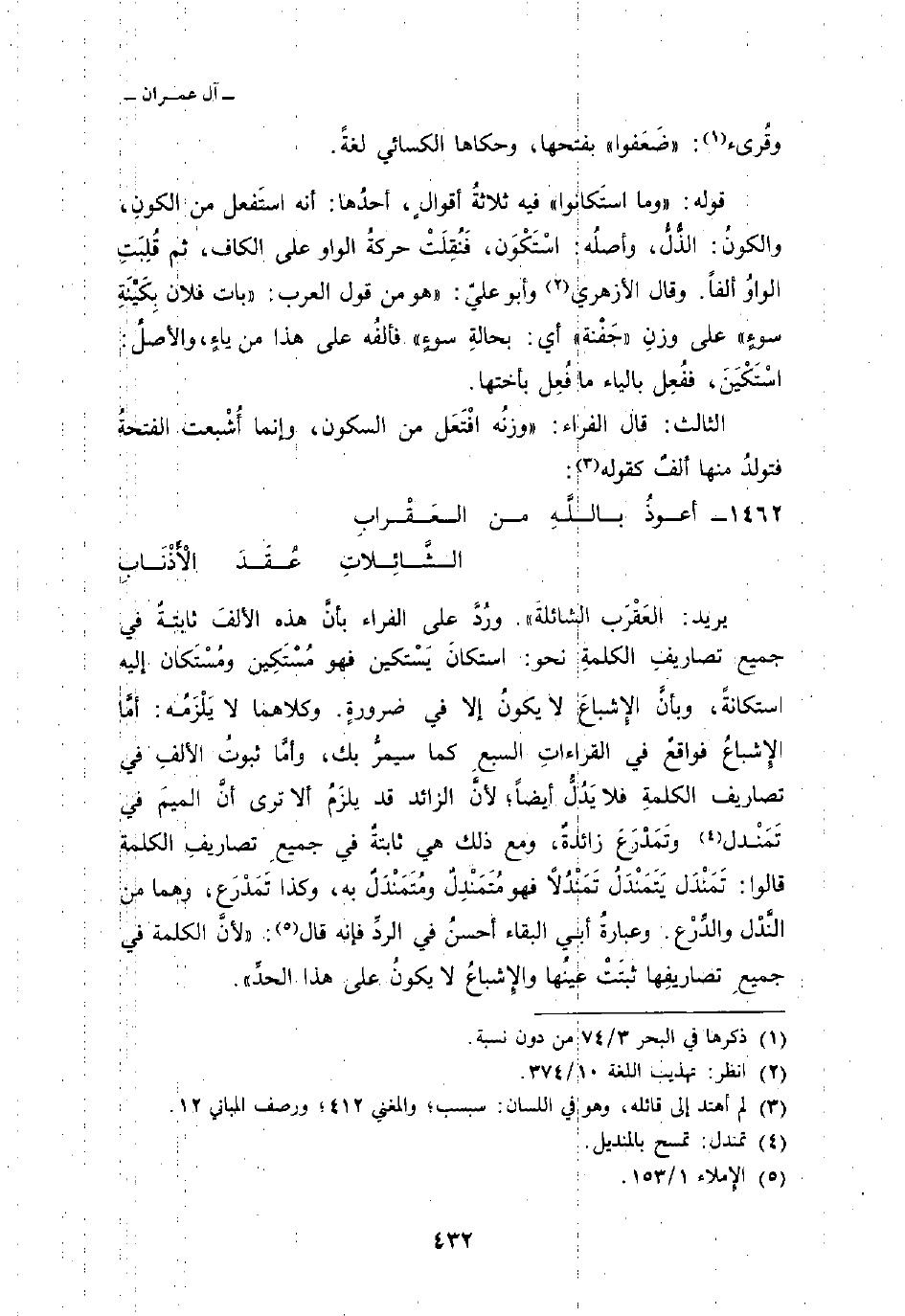 يريد: العَقْرَب الشائلةَ» . ورُدَّ على الفراء بأنَّ هذه الألفَ ثابتةٌ في جميع تصاريفِ الكلمةِ نحو: استكانَ يَسْتكين فهو مُسْتَكِين ومُسْتَكان إليه استكانةً، وبأنَّ الإِشباعَ لا يكونُ إلا في ضرورةٍ. وكلاهما لا يَلْزَمُه: أمَّا الإِشباعُ فواقعٌ في القراءاتِ السبعِ كما سيمرُّ بك، وأمَّا ثبوتُ الألفِ في تصاريف الكلمةِ فلا يَدُلُّ أيضاً؛ لأنَّ الزائد قد يلزَمُ ألا ترى أنَّ الميمَ في تَمَنْدل وتَمَدْرَعَ زائدةٌ، ومع ذلك هي ثابتةٌ في جميعِ تصاريفِ الكلمة قالوا: تَمَنْدل يَتَمَنْدَلُ تَمَنْدُلاً فهو مُتَمَنْدِلٌ ومُتَمَنْدَلٌ به، وكذا تَمَدْرَع، وهما من النَّدْل والدِّرْع. وعبارةُ أبي البقاء أحسنُ في الردِّ فإنه قال: «لأنَّ الكلمة في جميعِ تصاريفِها ثبتَتْ عينُها والإِشباعُ لا يكونُ على هذا الحدِّ» .