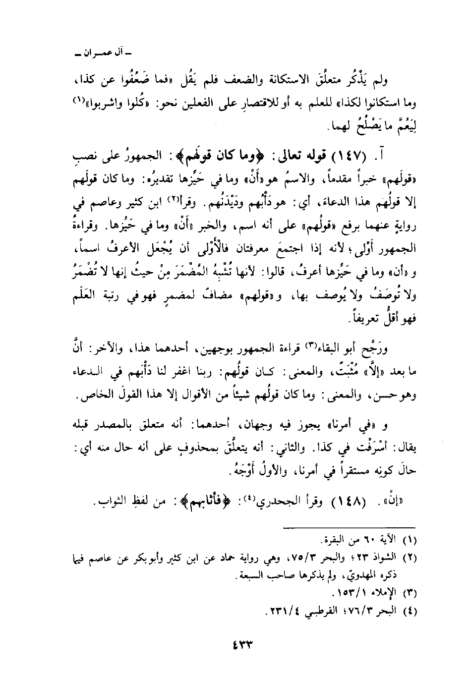 ورَجَّح أبو البقاء قراءة الجمهور بوجهين، أحدهما هذا، والآخر: أنَّ ما بعد «إلاَّ» مُثْبَتٌ، والمعنى: كان قولُهم: ربنا اغفر لنا دَأْبَهم في الدعاء وهو حسن، والمعنى: وما كان قولُهم شيئاً من الأقوال إلا هذا القولَ الخاص.