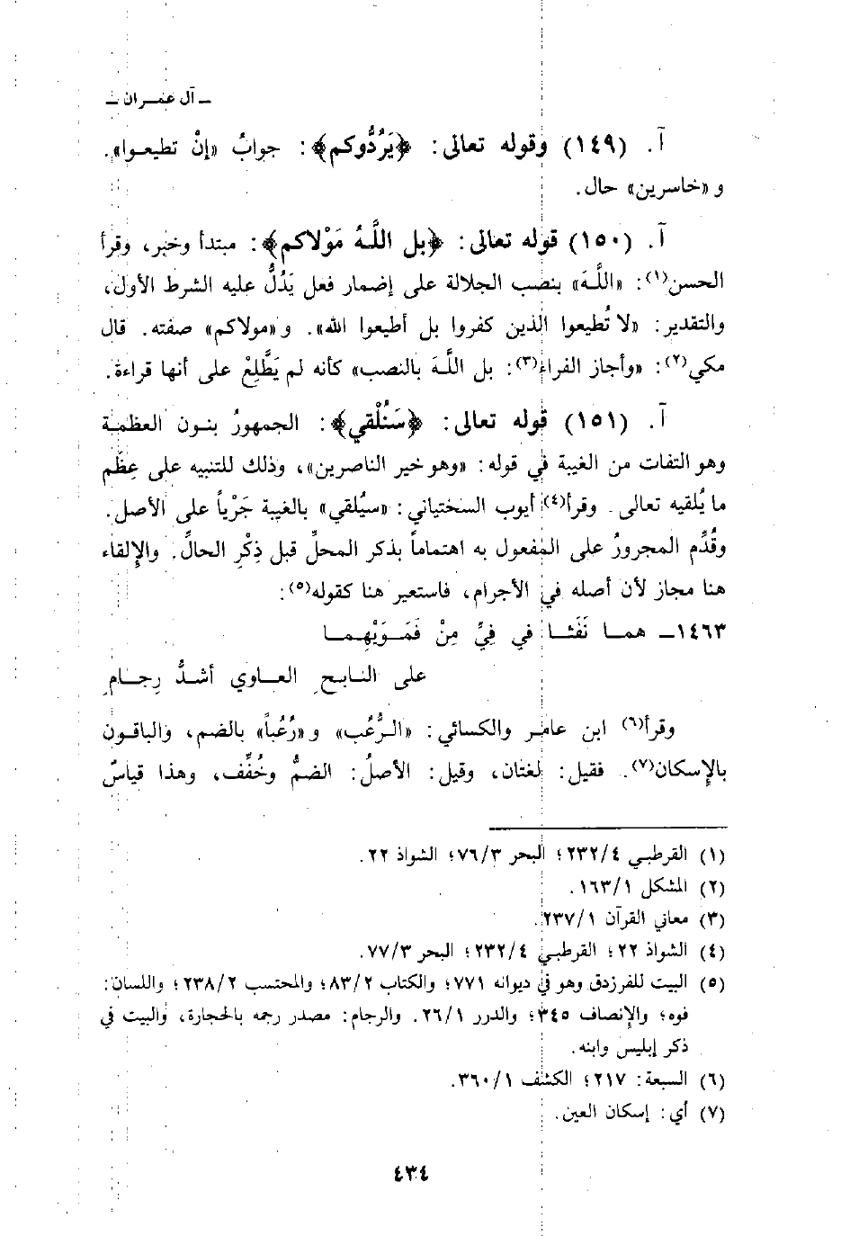 قوله تعالى: {سَنُلْقِي} : الجمهورُ بنون العظمة وهو التفات من الغيبة في قوله: {وَهُوَ خَيْرُ الناصرين} ، وذلك لتنبيه على عِظَم ما يُلقيه تعالى. وقرأ أيوب السختياني: «سيُلقي» بالغيبة جَرْياً على الأصل. وقُدِّم المجرورُ على المفعول به اهتماماً بذكر المحلِّ قبل ذِكْرِ الحالِّ. والإِلقاء هنا مجاز لأن أصله في الأجرام، فاستعير هنا كقوله:
