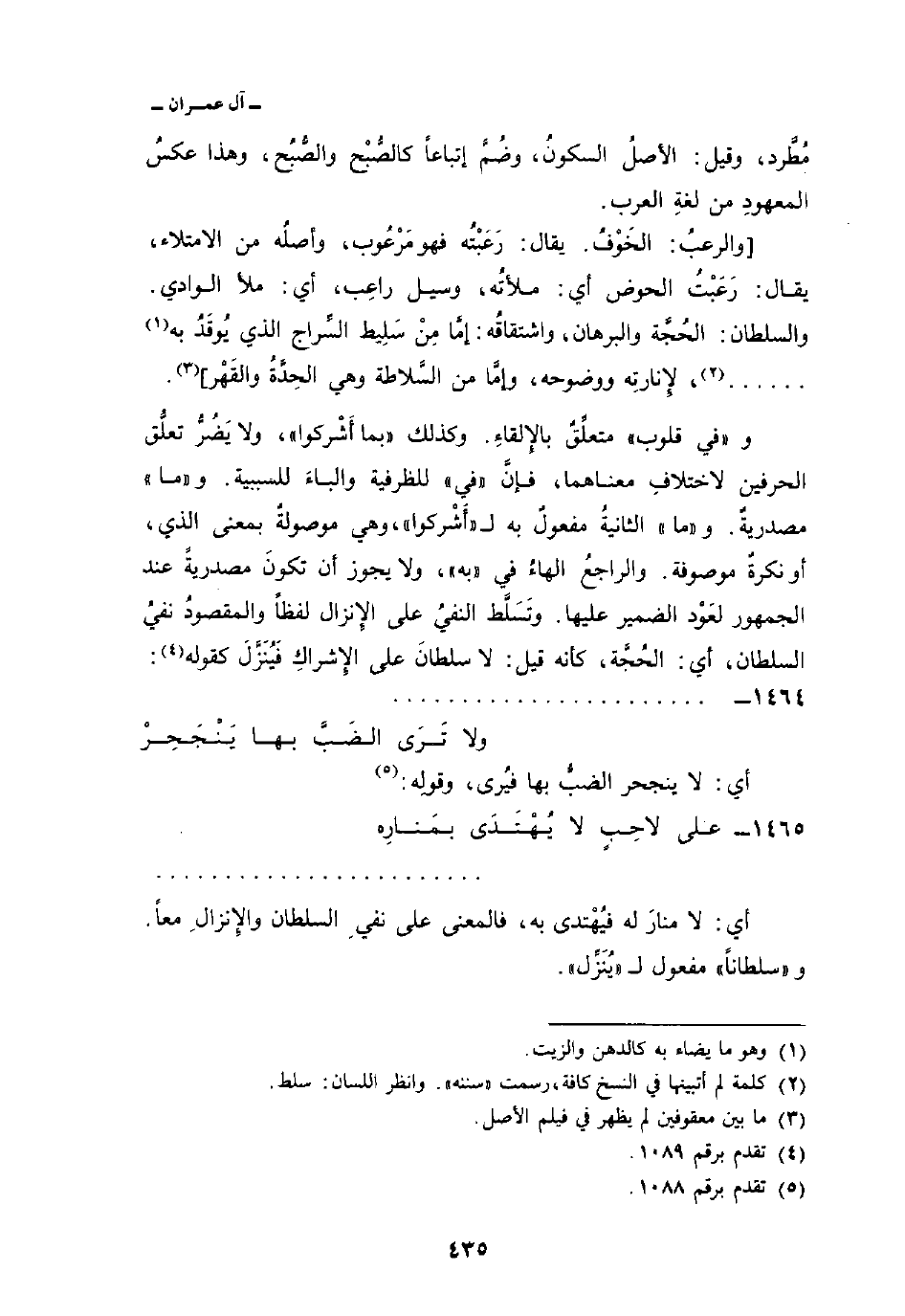 [والرعبُ: الخَوْفُ. يقال: رَعَبْتُه فهو مَرْعُوب، وأصلُه من الامتلاء، يقال: رَعَبْتُ الحوض أي: ملأتُه، وسيل راعِب، أي: ملأ الوادي. والسلطان: الحُجَّة والبرهان، واشتقاقُه: إمَّا مِنْ سَلِيط السِّراج الذي يُوقَدُ به. . . . . .، لإِنارتِه ووضوحه، وإمَّا من السَّلاطة وهي الحِدَّةُ والقَهْر] .