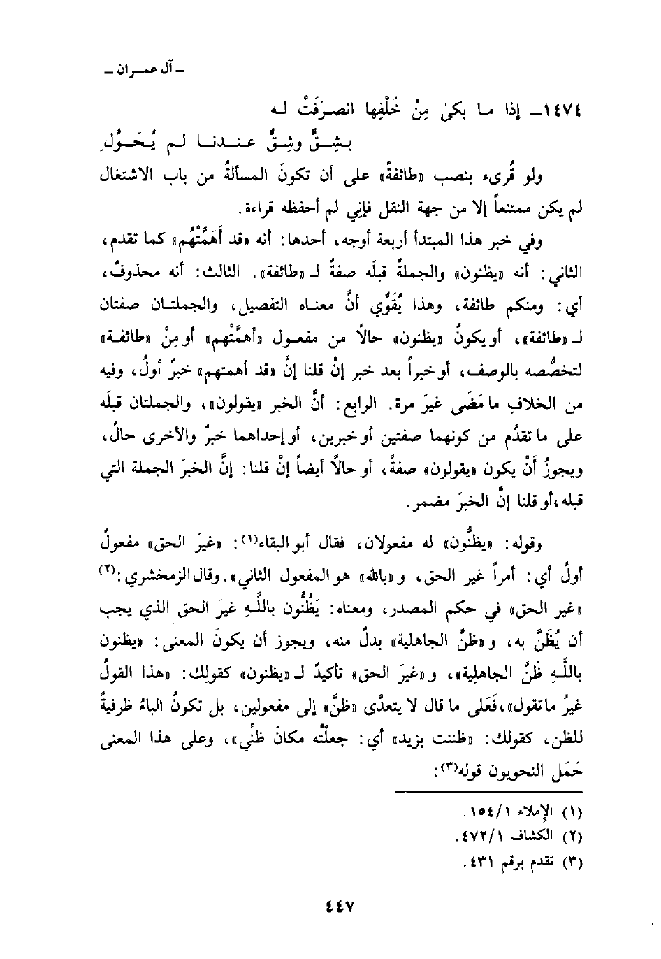وفي خبر هذا المبتدأ أربعة أوجه، أحدها: أنه «قد أَهَمَّتْهُم» كما تقدم، الثاني: أنه «يظنون» والجملةُ قبلَه صفةٌ ل «طائفة» . الثالث: أنه محذوفٌ، أي ومنكم طائفة وهذا يُقَوِّي أنَّ معناه التفصيل، والجملتان صفتان ل «طائفة» ، أو يكونُ «يظنون» حالاً من مفعول «أهمَّتْهم» أو مِنْ «طائفة» لتخصُّصه بالوصف، أو خبراً بعد خبر إنْ قلنا إنَّ «قد أهمتهم» خبرٌ أولُ، وفيه من الخلافِ ما مَضَى غيرَ مرة.