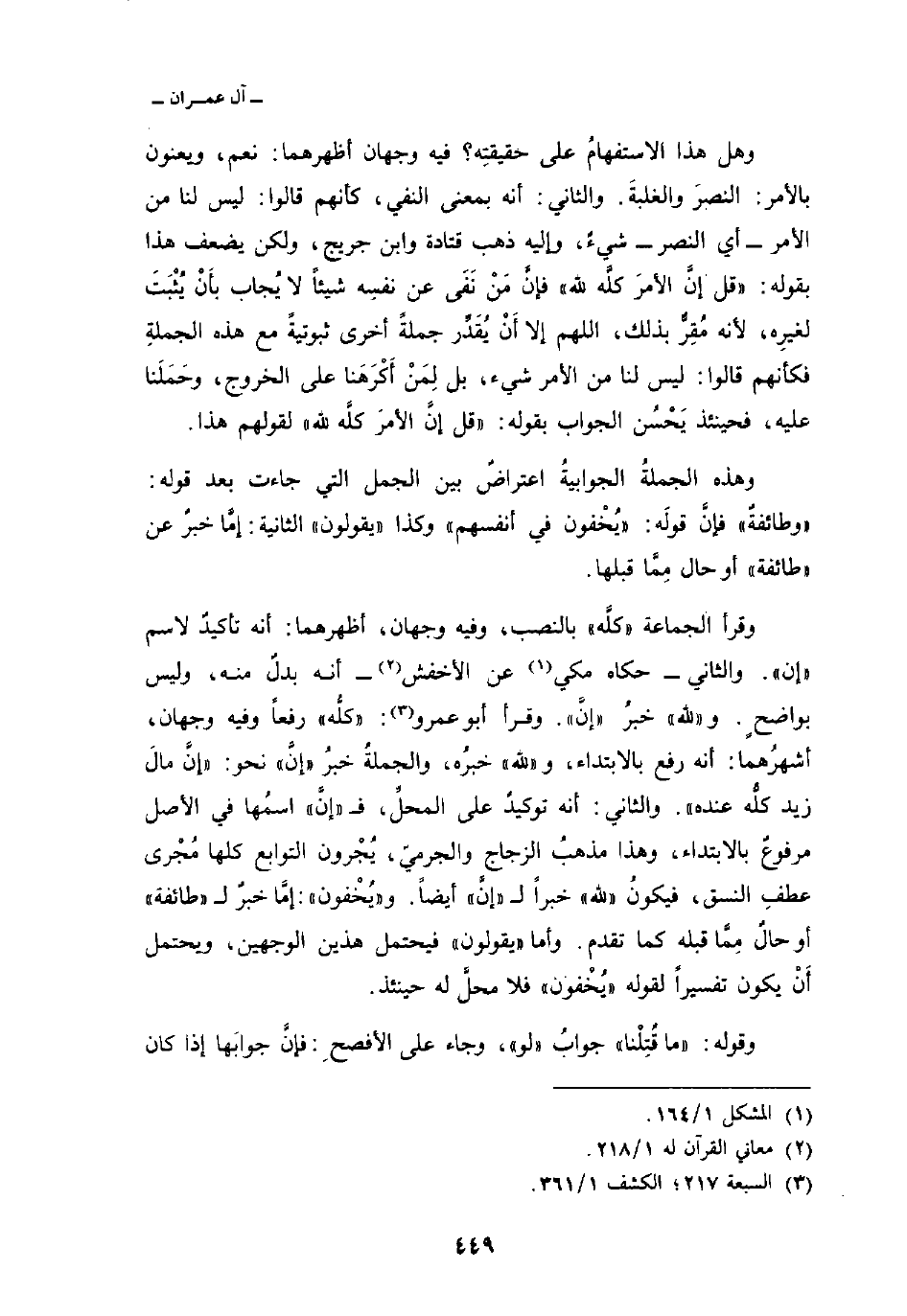 وقرأ الجماعة «كلَّه» بالنصب، وفيه وجهان، أظهرهما: أنه تأكيدٌ لاسم «إن» . والثاني حكاه مكي عن الأخفش أنه بدلٌ منه، وليس بواضحٍ. و «لله» خبرُ «إنْ» . وقرأ أبو عمرو: «كلُّه» رفعاً وفيه وجهان، أشهرُهما: أنه رفع بالابتداء، و «لله» خبرُه، والجملةُ خبرُ «إنَّ» نحو: «إنَّ مالَ زيد كلُّه عنده» . والثاني: أنه توكيدٌ على المحلِّ، ف «إنَّ» اسمُها في الأصل مرفوعٌ بالابتداء، وهذا مذهبُ الزجاج والجرميّ، يُجْرون التوابع كلها مُجْرى عطفِ النسق، فيكونُ «لله» خبراً ل «إنَّ» أيضاً. و «يُخْفون» : إمَّا خبرُ ل «طائفة» أو حالٌ مِمَّا قبله كما تقدم. وأما «يقولون» فيحتمل هذين الوجهين، ويحتمل أَنْ يكون تفسيراً لقوله «يُخْفون» فلا محلَّ له حينئذ.