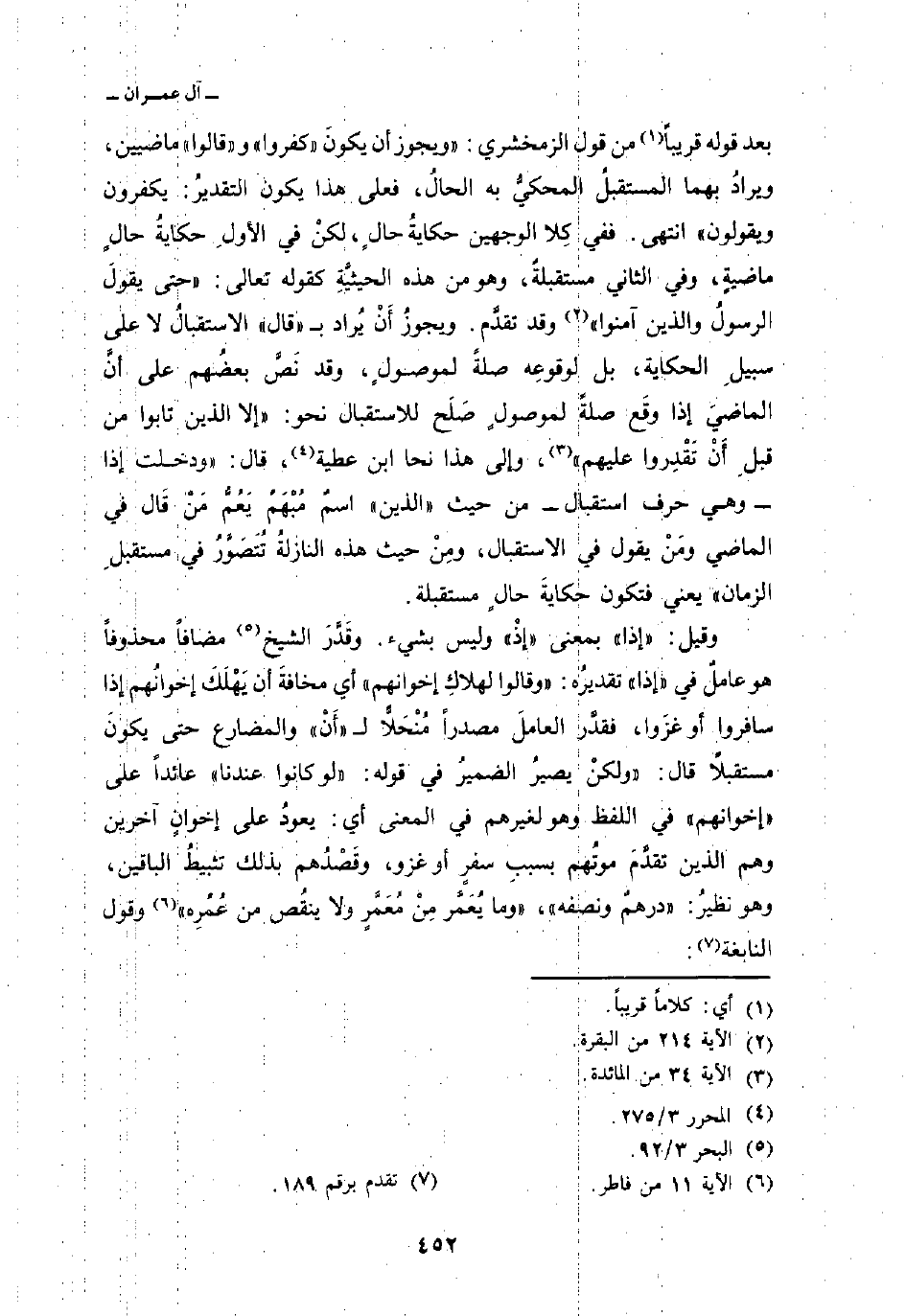 بعد قوله قريباً من قول الزمخشري:» ويجوز أن يكونَ «كفروا» و «قالوا» ماضيين، ويرادُ بهما المستقبلُ المحكيُّ به الحالُ، فعلى هذا يكون التقديرُ: يكفرون ويقولون «انتهى. ففي كِلا الوجهين حكايةٌ حالٍ، لكنْ في الأولِ حكايةٌ حالٍ ماضيةٍ، وفي الثاني مستقبلةٌ، وهو من هذه الحيثيَّةِ كقوله تعالى: {حتى يَقُولَ الرسول والذين آمَنُواْ} [البقرة: 214] وقد تقدَّم. ويجوزُ أَنْ يُراد ب» قال «الاستقبالُ لا على سبيلِ الحكاية، بل لوقوعِه صلةً لموصولٍ، وقد نَصَّ بعضُهم على أنَّ الماضيَ إذا وقَع صلةً لموصولٍ صَلَح للاستقبال نحو: {إِلاَّ الذين تَابُواْ مِن قَبْلِ أَن تَقْدِرُواْ عَلَيْهِمْ} [المائدة: 34] ، وإلى هذا نحا ابن عطية، قال:» ودخلت إذا وهي حرف استقبال من حيث «الذين» اسمٌ مُبْهَمٌ يَعُمُّ مَنْ قَال في الماضي ومَنْ يقول في الاستقبال، ومِنْ حيث هذه النازلةُ تُتَصَوَّرُ في مستقبلِ الزمان «يعني فتكون حكايةَ حالٍ مستقبلة.