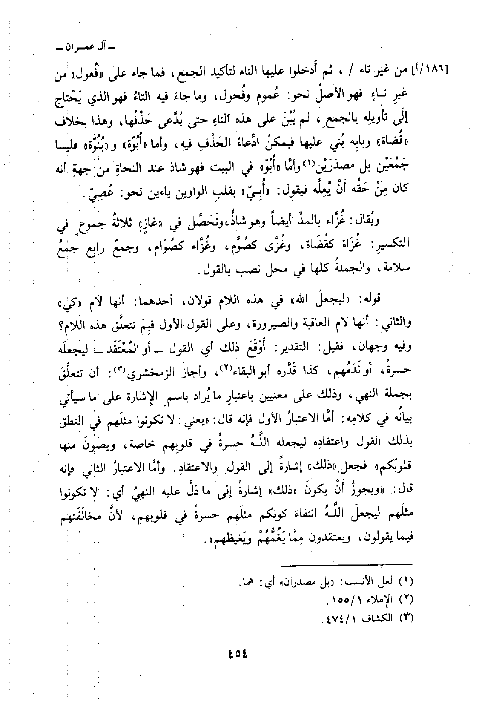 من غير تاء/، ثم أَدخلوا عليها التاء لتأكيد الجمع، فما جاء على «فُعول» من غير تاءٍ فهو الأصلُ نحو: عُموم وفُحول، وما جاءَ فيه التاءُ فهو الذي يَحْتاج إلَى تأويِلِه بالجمعِ، لم يُبْنَ على هذه التاءِ حتى يُدَّعى حَذْفُها، وهذا بخلاف «قُضاة» وبابِه بُني عليها فيمكنُ ادِّعاءُ الحَذْفِ فيه، وأما «أُبُوّة» و «بُنُوّة» فليسا جَمْعَيْن بل مصدَرَيْن وأمَّا «أُبُوّ» في البيت فهو شاذ عند النحاةِ من جهةِ أنه كان مِنْ حَقِّه أَنْ يُعِلَّه فيقول: «أُبِيّ» بقلبِ الواوين ياءين نحو: عُصِيّ.