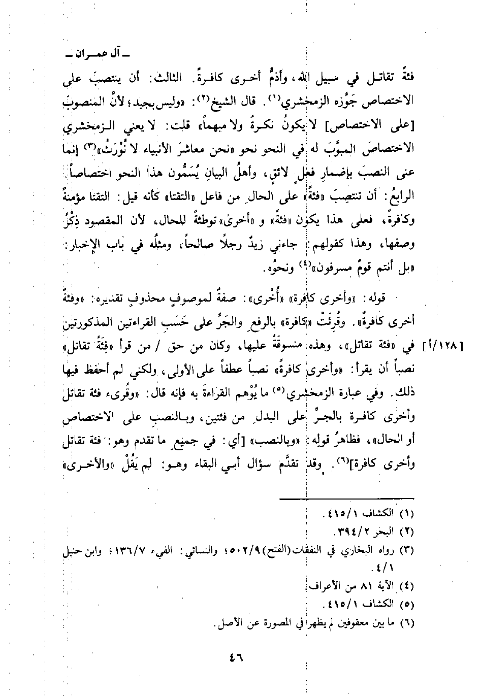 فئةً تقاتل في سبيل الله، وأذمُّ أخرى كافرةً. الثالث: أن ينتصبَ على الاختصاص جَوَّزه الزمخشري. قال الشيخ: «وليس بجيد؛ لأنَّ المنصوبَ [على الاختصاص] لا يكونُ نكرةً ولا مبهماً» قلت: لا يعني الزمخشري الاختصاصَ المبوَّبَ له في النحو نحو «نحن معاشرَ الأنبياء لا نُوْرَثُ» إنما عنى النصبَ بإضمارِ فعلٍ لائقٍ، وأهلُ البيانِ يُسَمُّون هذا النحو اختصاصاً. الرابعُ: أن تنتصِبَ «فئةً» على الحالِ من فاعل «التقتا» كأنه قيل: التقتا مؤمنةً وكافرةً، فعلى هذا يكون «فئةً» و «أخرى» توطئةً للحال، لأن المقصود ذِكْرُ وصفها، وهذا كقولهم: جاءني زيدٌ رجلاً صالحاً، ومثلُه في باب الإِخبار: {بَلْ أَنْتُمْ قَوْمٌ مُّسْرِفُونَ} [الأعراف: 81] ونحوُه.