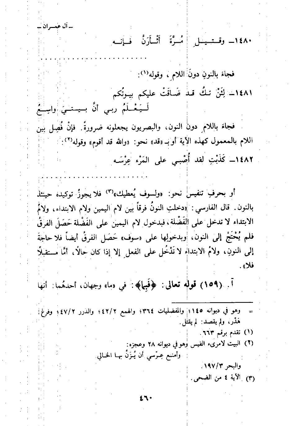 فجاء باللامِ دون النون، والبصريون يجعلونه ضرورةَ. فإنْ فُصِل بين اللام بالمعمول كهذه الآية أو ب «قد» نحو: «والله قد أقوم» وقوله: