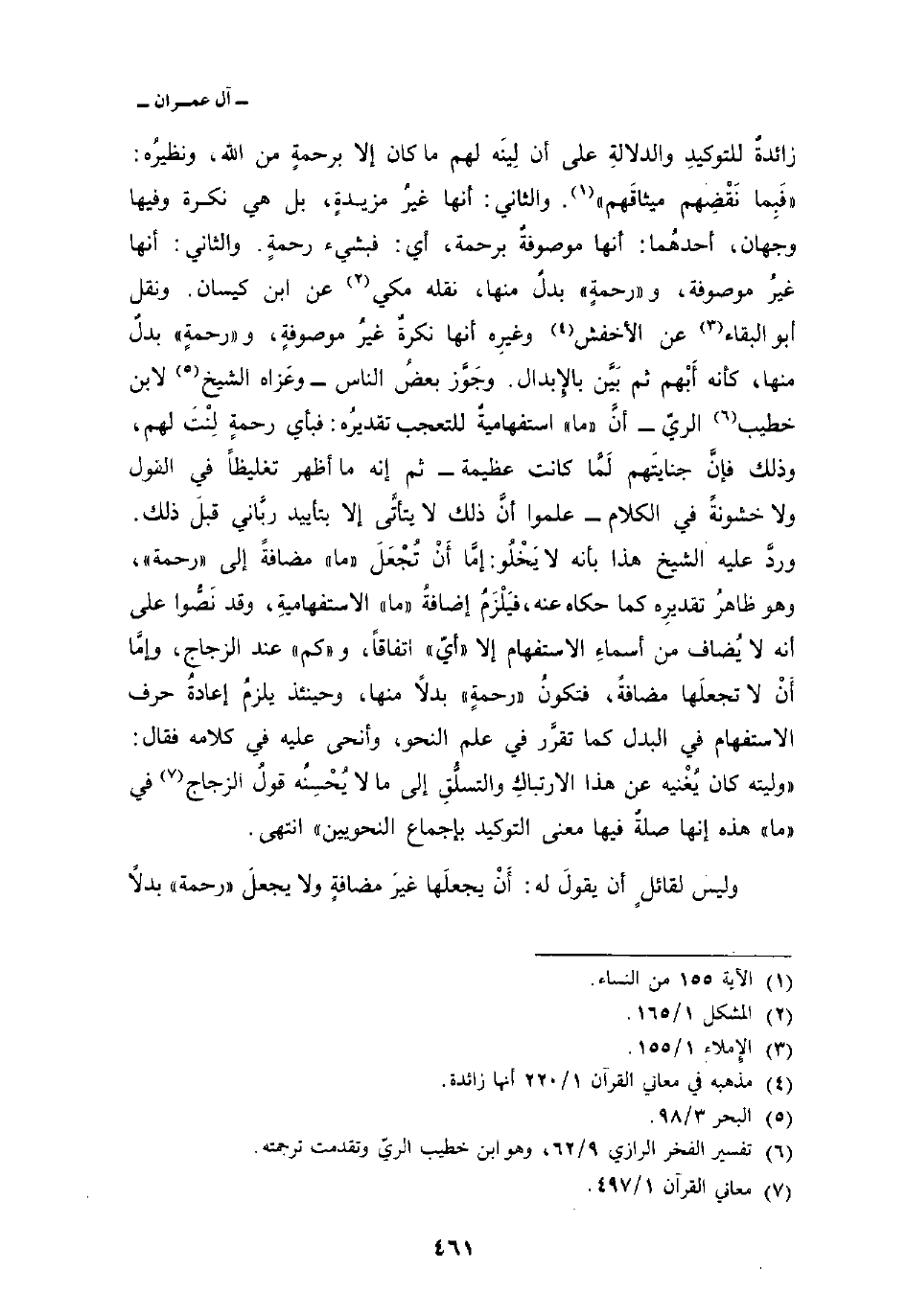 زائدةٌ للتوكيدِ والدلالةِ على أن لِينَه لهم ما كان إلا برحمةٍ من الله، ونظيرُه: {فَبِمَا نَقْضِهِمْ مَّيثَاقَهُمْ} [النساء: 155] . والثاني: أنها غيرُ مزيدةٍ، بل هي نكرة وفيها وجهان، أحدهُما: أنها موصوفةٌ برحمة، أي: فبشيء رحمةٍ والثاني: أنها غيرُ موصوفة، و «رحمةٍ» بدلٌ منها، نقله مكي عن ابن كيسان. ونقل أبو البقاء عن الأخفش وغيره أنها نكرةٌ غيرُ موصوفةٍ، و «رحمةٍ» بدلٌ منها، كأنه أَبْهم ثم بَيَّن بالإِبدال. وجَوَّز بعضُ الناس وعَزاه الشيخ لابن خطيب الريّ أنَّ «ما» استفهاميةٌ للتعجب تقديرُه: فبأي رحمةٍ لِنْتَ لهم، وذلك فإنَّ جنايتَهم لَمَّا كانت عظيمة ثم إنه ما أظهر تغليظاً في القول ولا خشونةً في الكلام علموا أنَّ ذلك لا يتأتَّى إلا بتأييد ربَّاني قبلَ ذلك. وردَّ عليه الشيخ هذا بأنه لا يَخْلُو: إمَّا أَنْ تُجْعَلَ «ما» مضافةً إلى «رحمة» ، وهو ظاهرُ تقديرِه كما حكاه عنه، فيَلْزَمُ إضافةُ «ما» الاستفهاميةِ، وقد نَصُّوا على أنه لا يُضاف من أسماءِ الاستفهام إلا «أيّ» اتفاقاً، و «كم» عند الزجاج، وإمَّا أَنْ لا تجعلَها مضافةً، فتكونُ «رحمةٍ» بدلاً منها، وحينئذ يلزمُ إعادةُ حرف الاستفهام في البدل كما تقرَّر في علم النحو، وأنحى عليه في كلامه فقال: «وليته كان يُغْنيه عن هذا الارتباكِ والتسلُّقِ إلى ما لا يُحْسِنُه قولُ الزجاج في» ما «هذه إنها صلةٌ فيها معنى التوكيد بإجماع النحويين» انتهى.